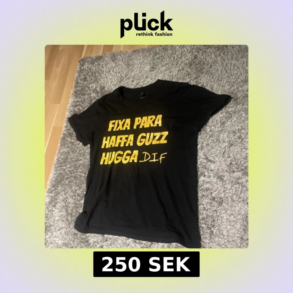 Svart t-shirt med tryck i gult: 'FIXA PARA HAFFA GUZZ HUGGA DIF'. Klassisk passform och rund hals. Perfekt statement-plagg för dig som vill sticka ut. Materialet känns mjukt och skönt mot huden.