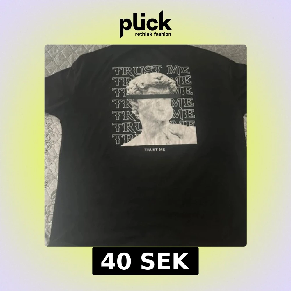 Cool svart t-shirt med stort grafiskt tryck på ryggen. Trycket visar en klassisk staty med texten 'TRUST ME' upprepad i bakgrunden. Perfekt för dig som gillar streetstyle och unika motiv.