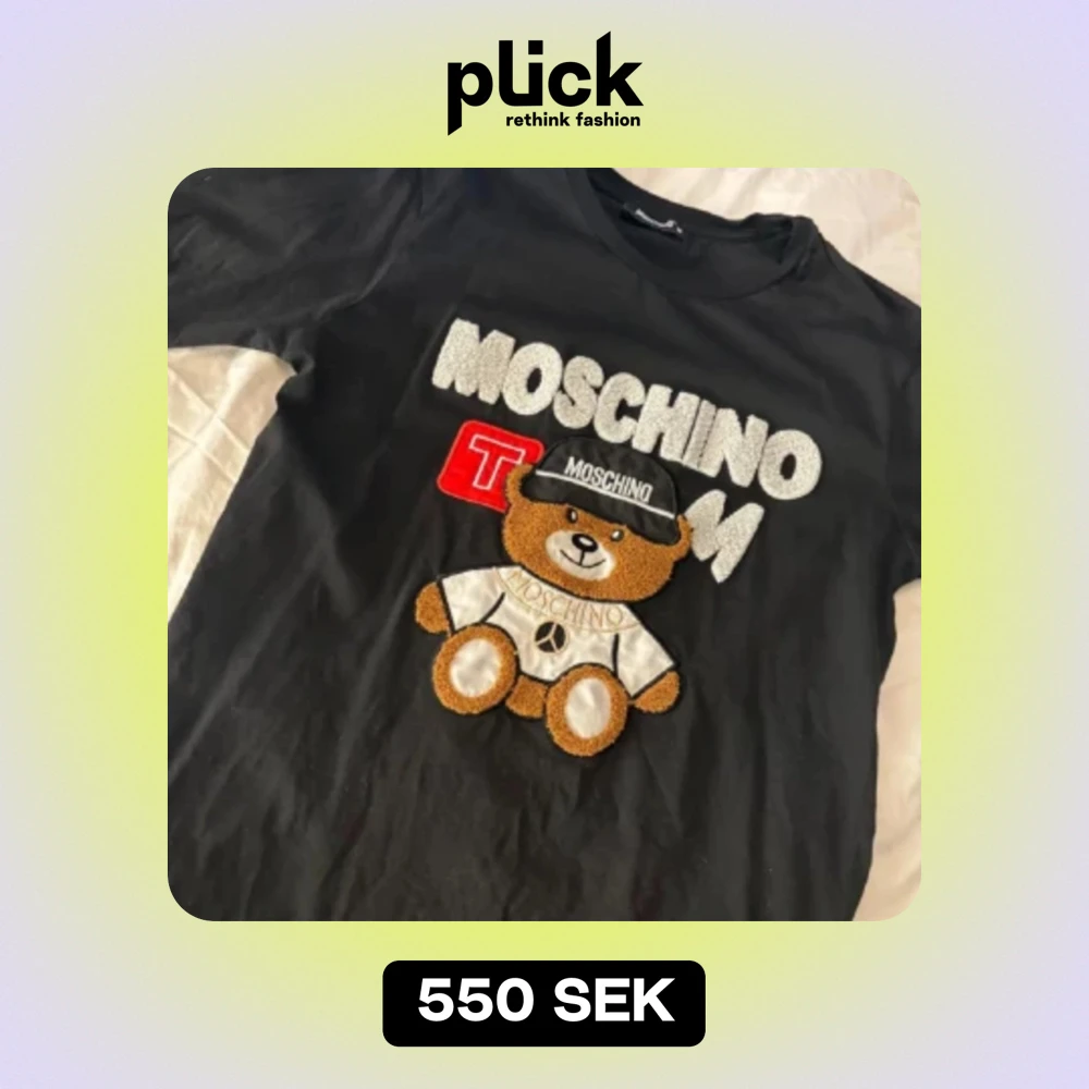 Säljer en svart t-shirt från Moschino med en stor, söt nalle på framsidan. Nallen har en keps med Moschino-loggan och en t-shirt med ett fredsmärke. Texten 'MOSCHINO' är i stora, vita bokstäver. Perfekt för en cool och avslappnad stil!