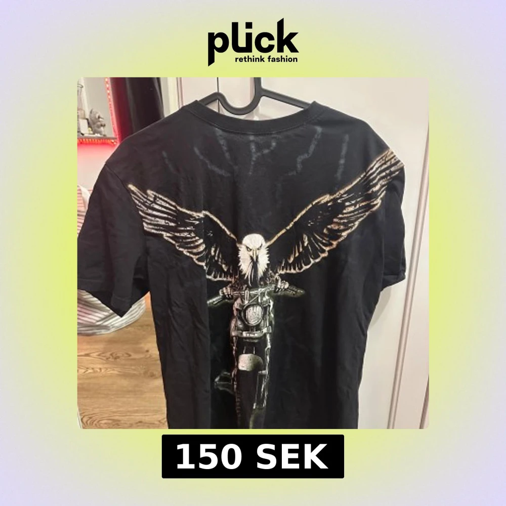 Cool svart t-shirt med ett stort tryck av en örn på en motorcykel . Perfekt för en avslappnad stil med en edgy touch.