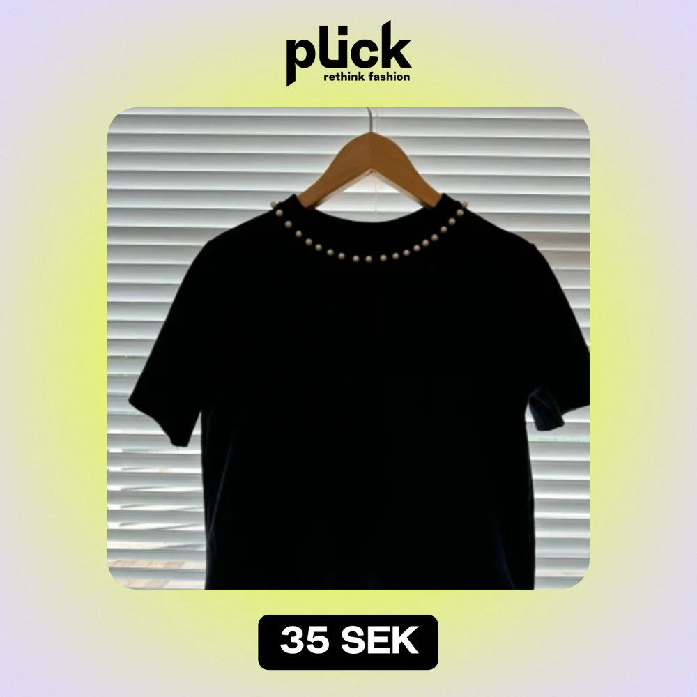 Jag säljer nu denna svarta t-shirt som har vita pärlor framtill vid halsen. (Pärlorna går ej hela vägen runt utan bara framtill) - tröjan är från Zara och är i väldigt gott skick då den knappt är använd