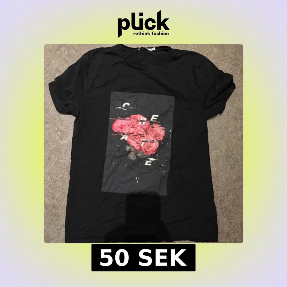 Svart t-shirt med coolt tryck av röda rosor och texten 'CREATE' i glitch-stil på bröstet, från nakd. Storlek M. Säljer för 50kr