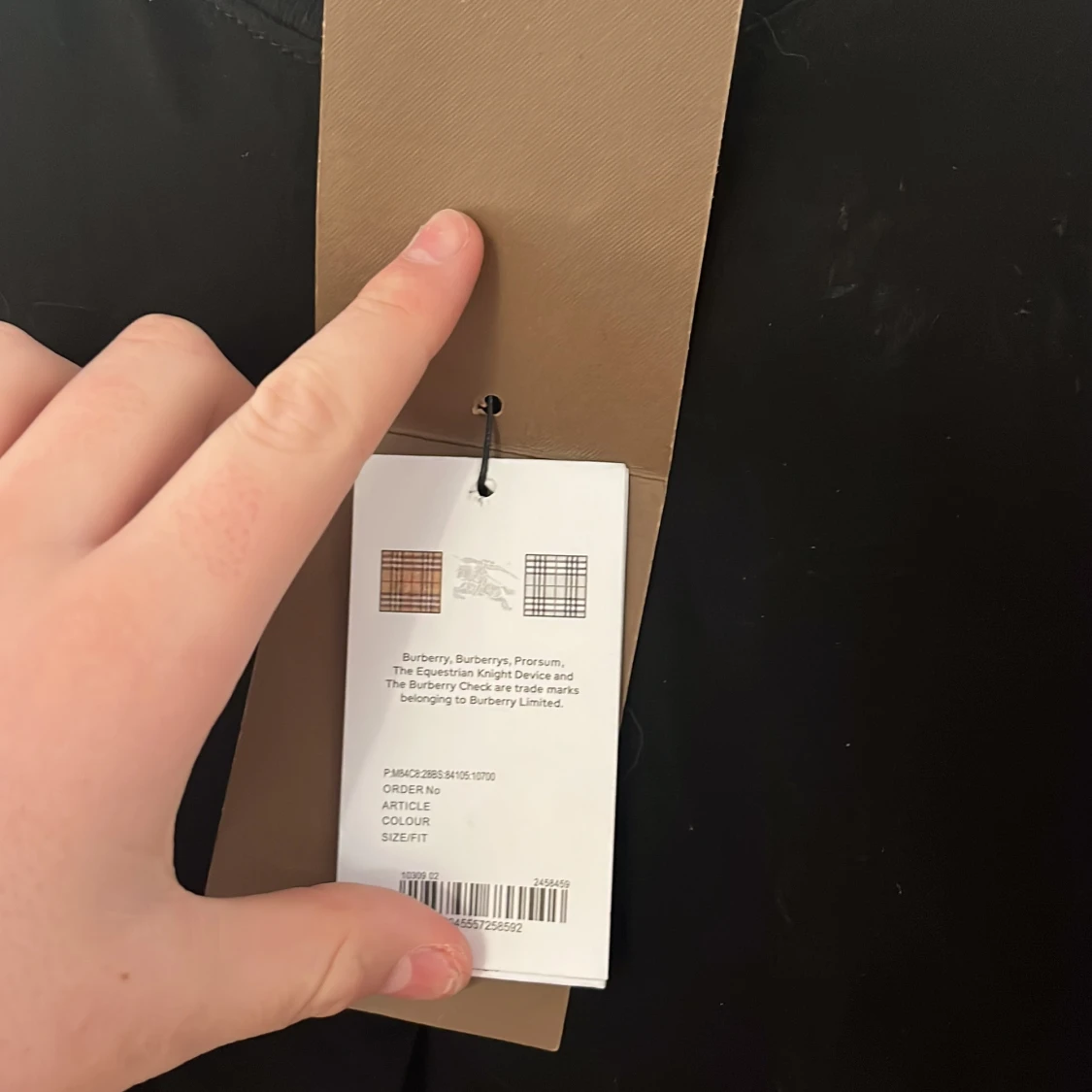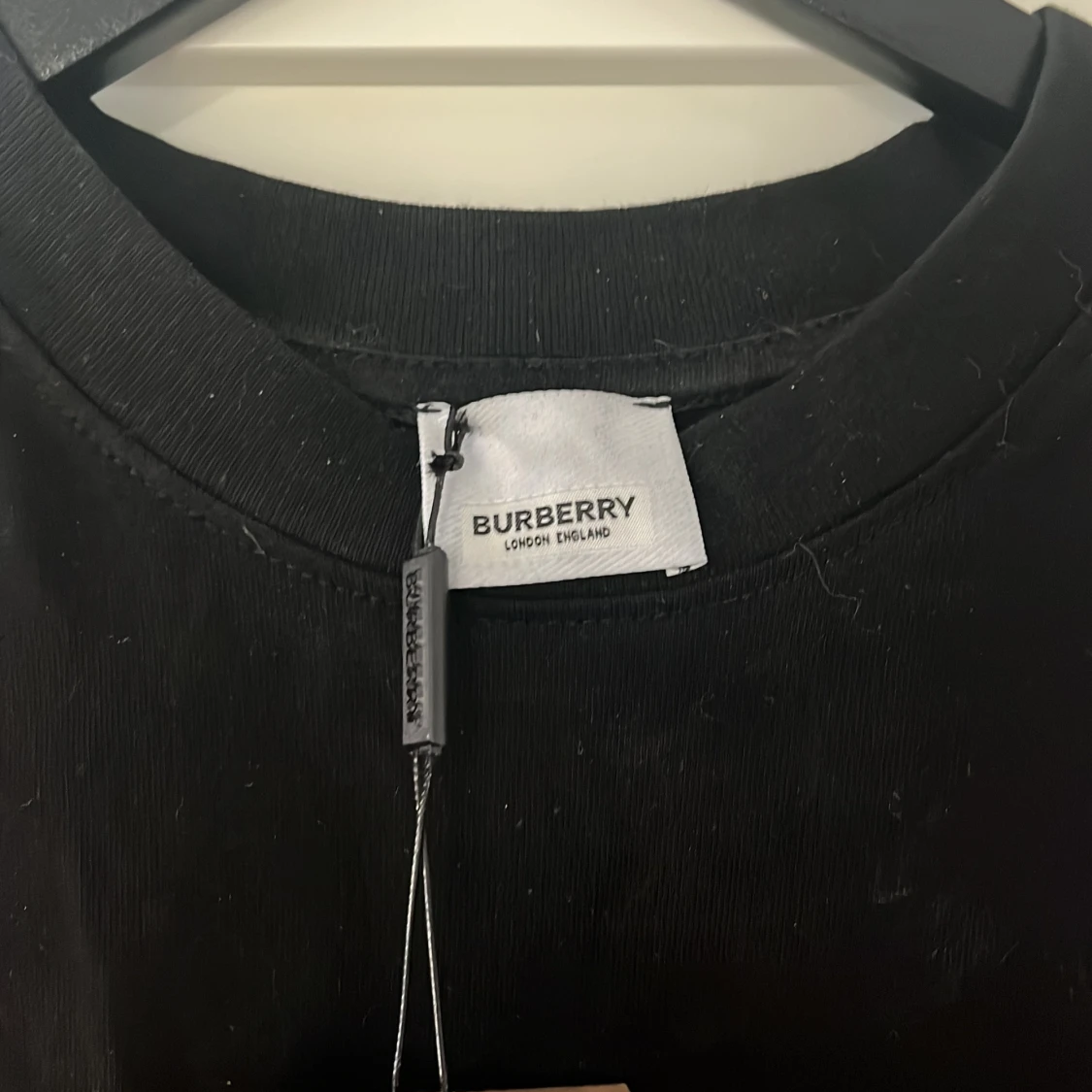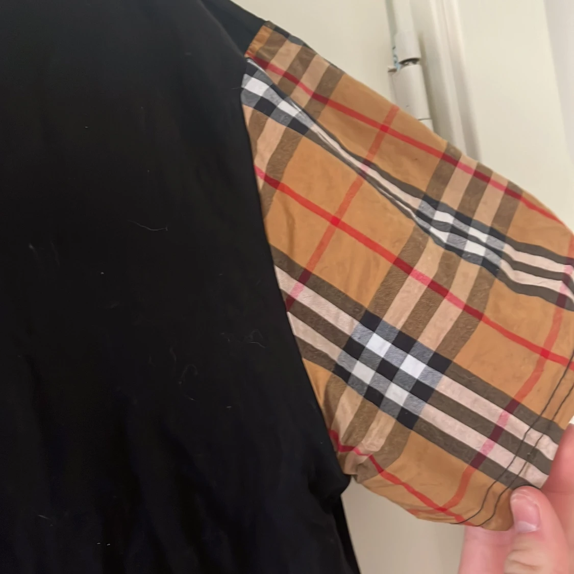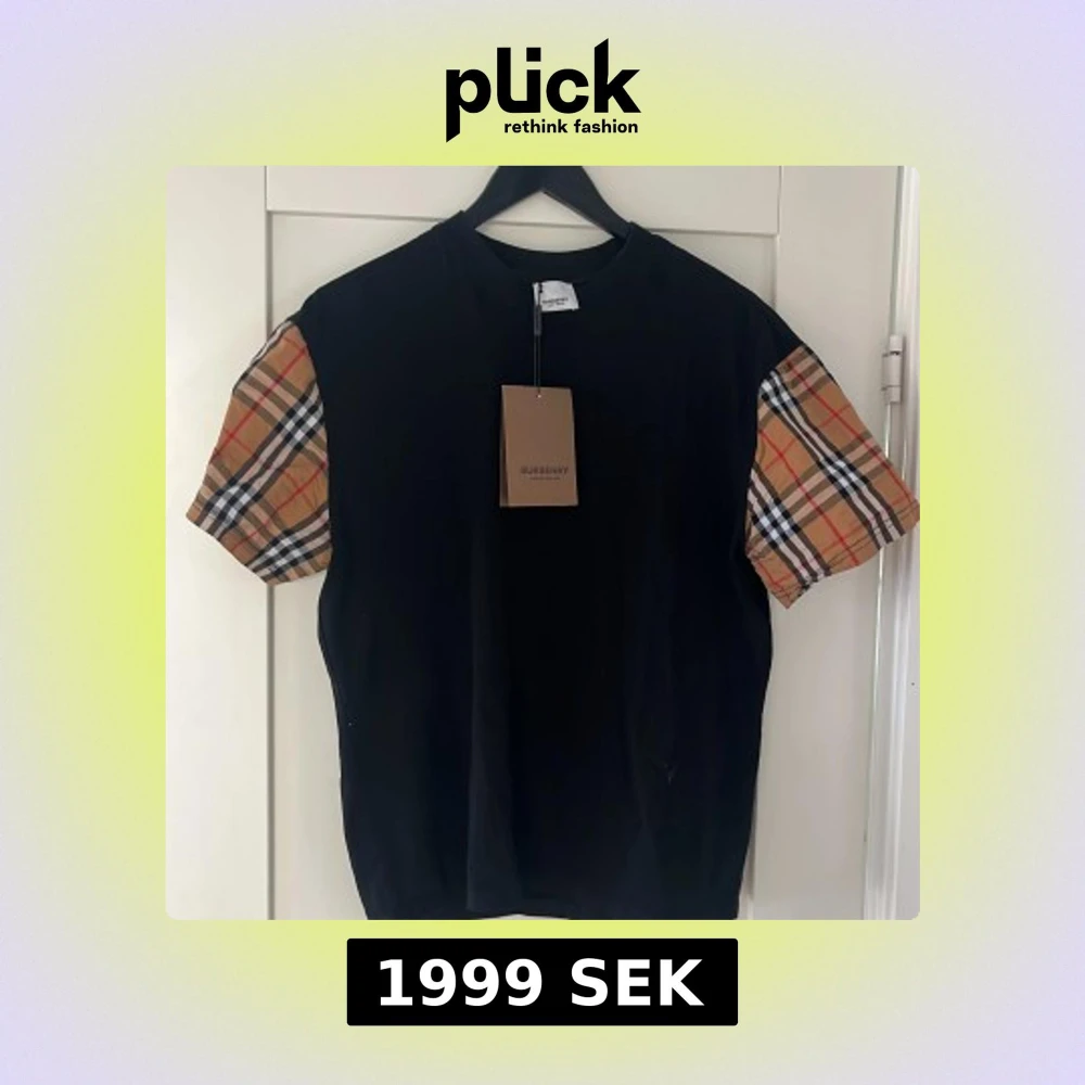 Snygg svart t-shirt från Burberry med deras ikoniska rutmönster på ärmarna. Perfekt för en stilren look med en touch av klassiskt mönster. T-shirten har en normal passform och är kortärmad. Är L men passar M