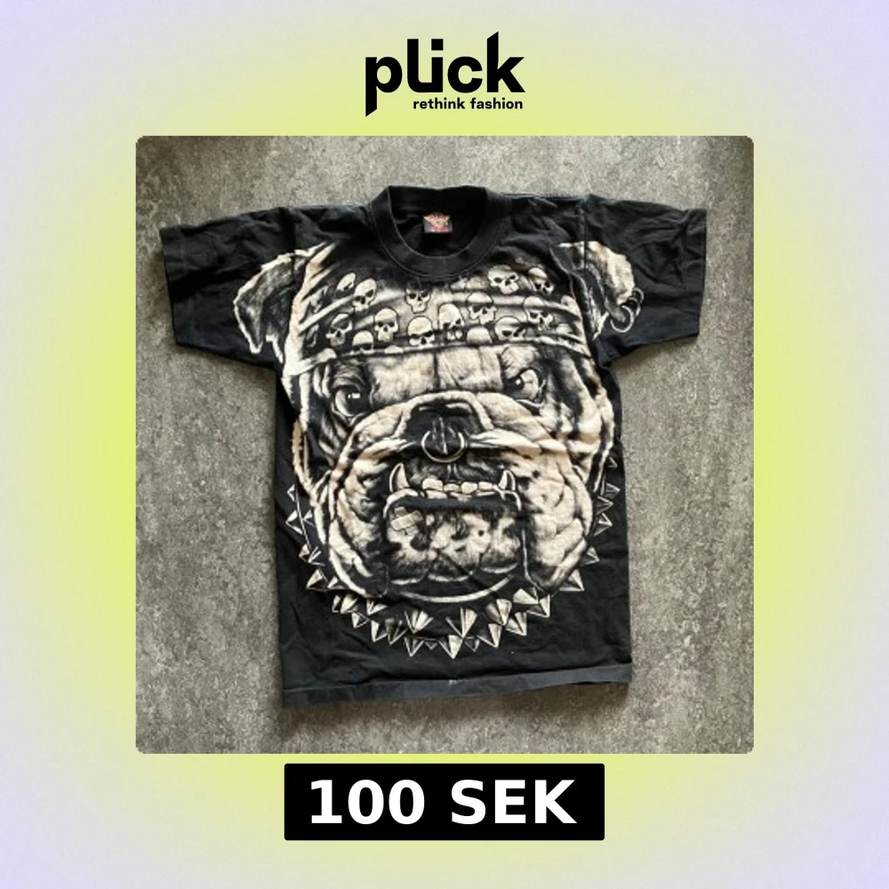 Cool svart t-shirt med ett stort tryck av en arg bulldog med nitar och dödskallar på både fram- och baksidan. Perfekt statement-plagg för dig som gillar unika och tuffa motiv.