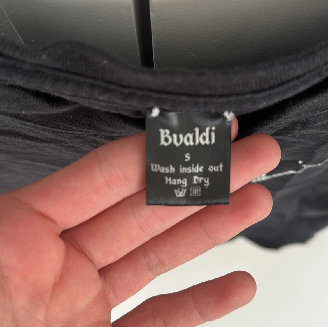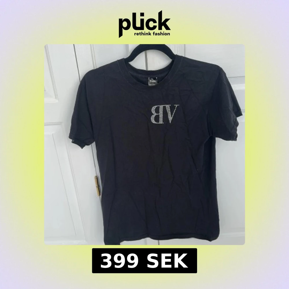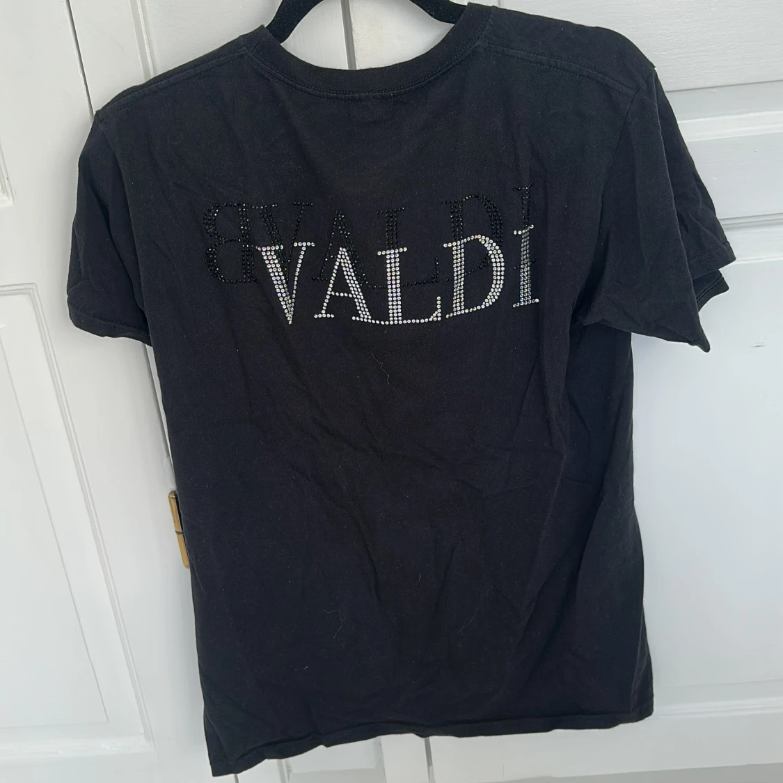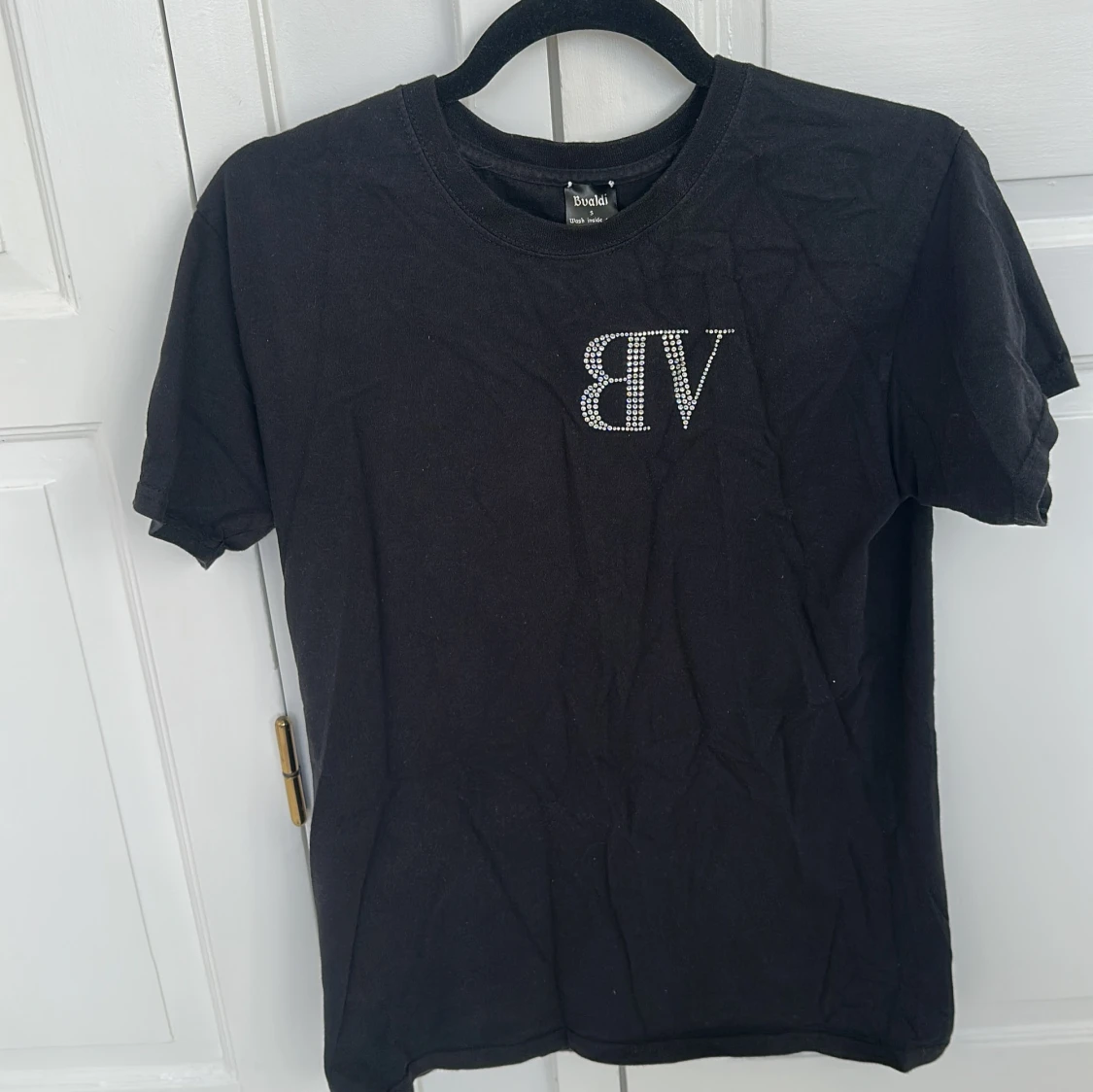 Svart t-shirt från Bvaldi i bomull med korta ärmar. Framsidan har ett glittrigt VB-tryck i strass och baksidan har BVALDI i stora strassbokstäver. Klassisk passform och rund halsringning. Perfekt för dig som gillar statement-plagg. Storlek S skicka 8/10 inga defekter