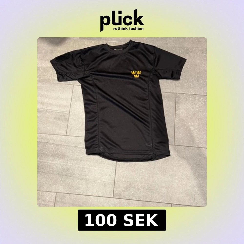 Säljer en svart t-shirt med korta ärmar och tre kronor broderade i gult på bröstet. T-shirten är i ett syntetmaterial som passar perfekt till träning eller sport. Snygg och sportig stil!