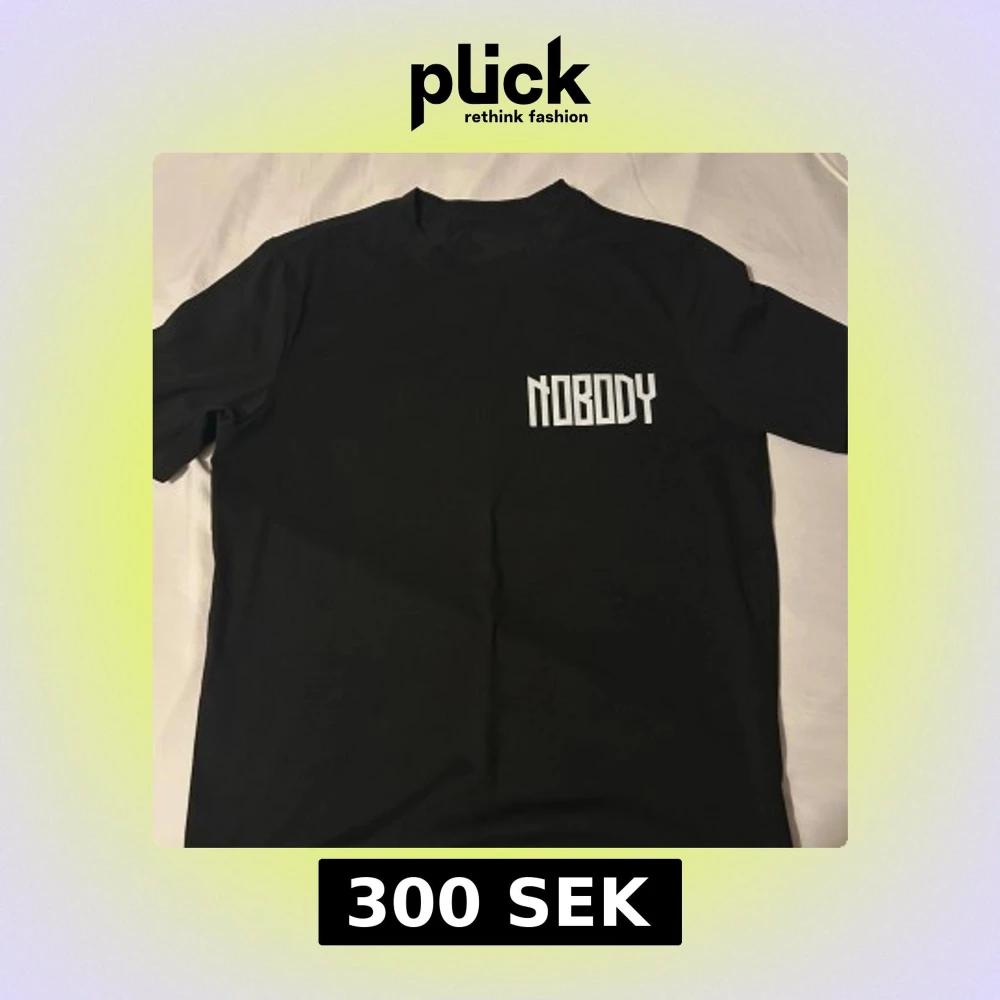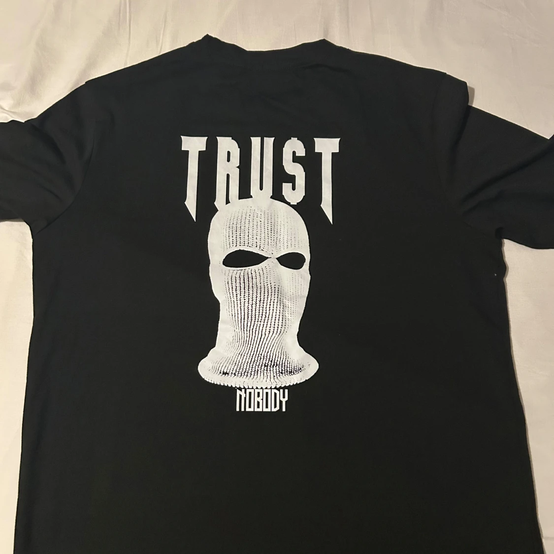 Cool svart t-shirt med texten 'NOBODY' på framsidan och ett stort tryck med texten 'TRUST NOBODY' och en mask på baksidan. Perfekt för en edgy look.