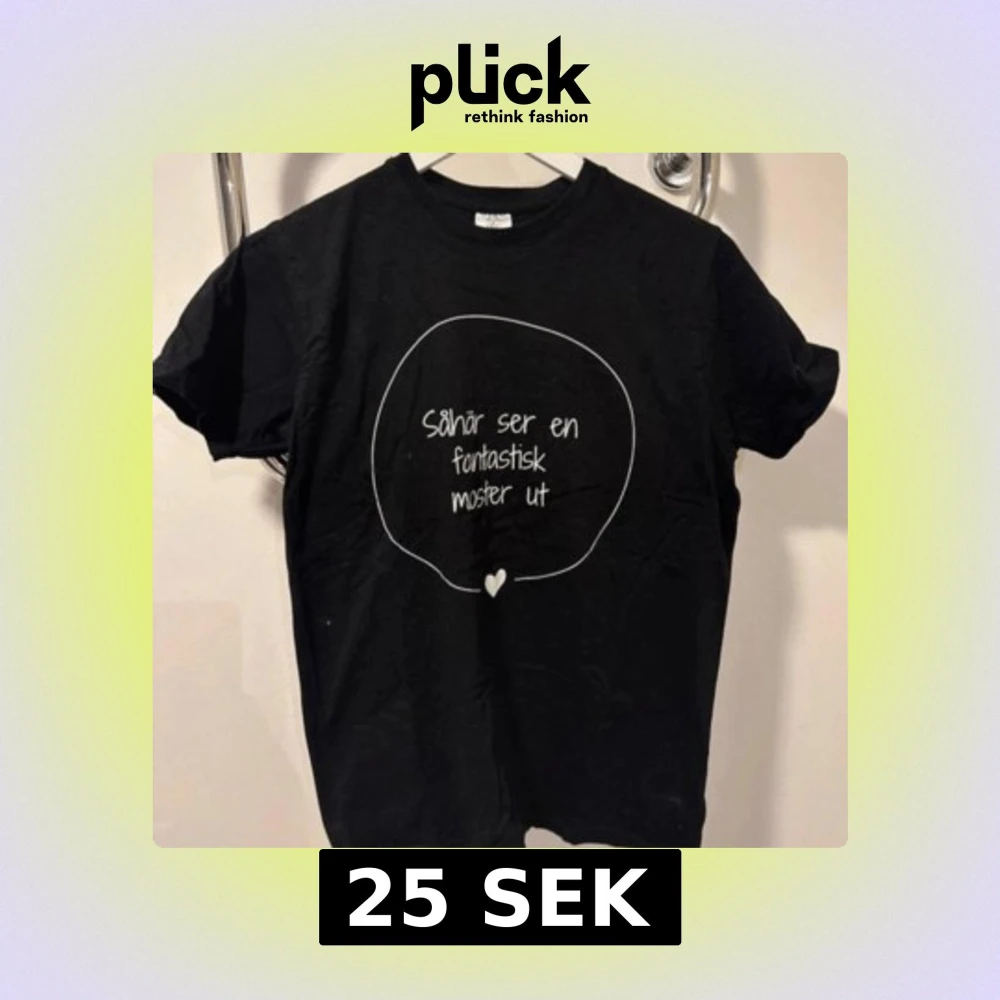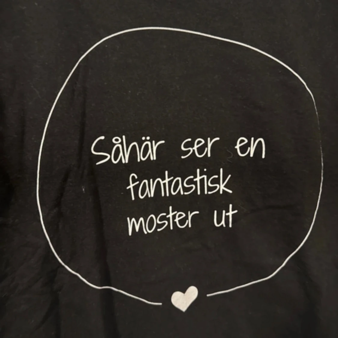 Svart t-shirt från B&C Collection i storlek S med rund hals och korta ärmar. Framsidan har ett vitt tryck med texten 'Såhär ser en fantastisk moster ut' inuti en handritad cirkel och ett litet hjärta. Tillverkad i mjuk bomull, perfekt för att visa lite extra attityd.