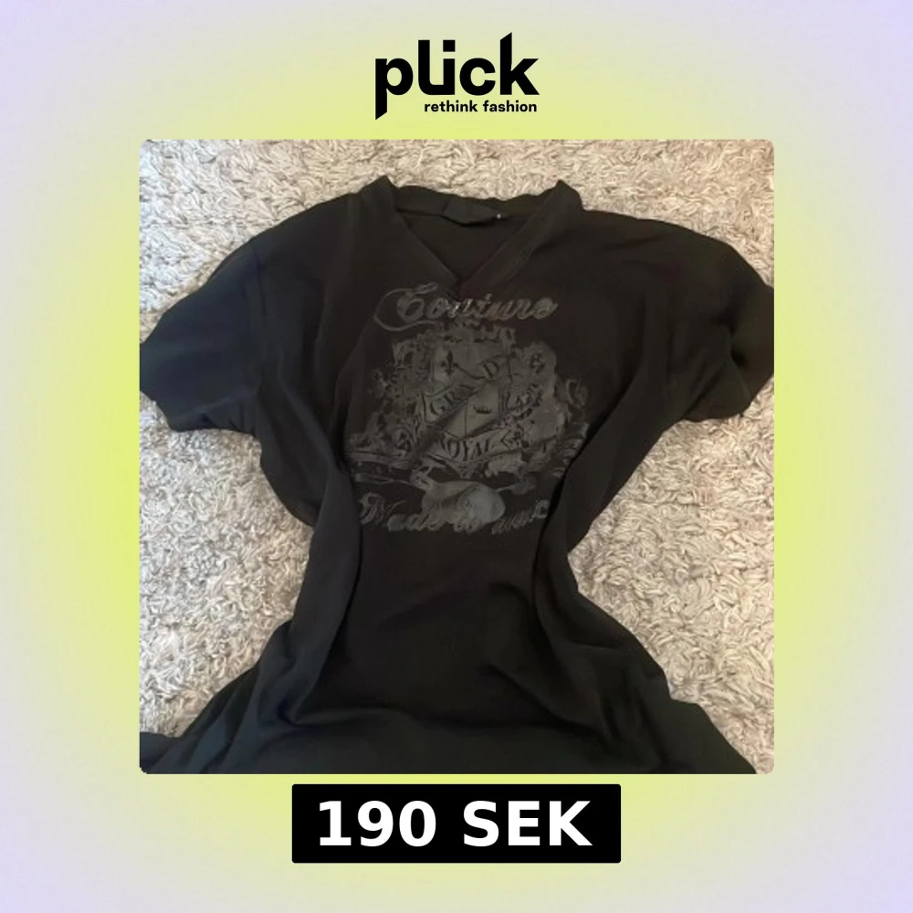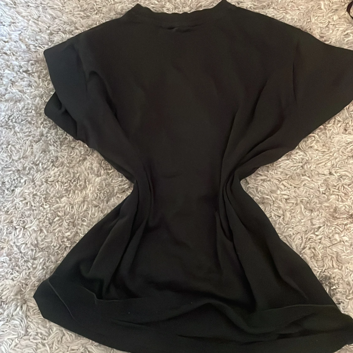 Säljer en svart t-shirt med ett snyggt tryck på framsidan. T-shirten har en v-ringad hals och korta ärmar. Perfekt för en avslappnad stil.