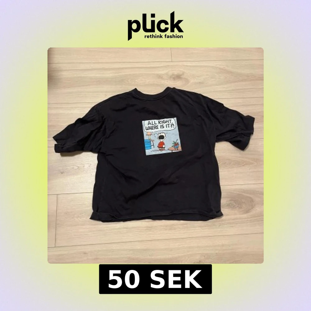 Säljer en svart t-shirt med ett tryck av en tecknad figur och texten 'ALL RIGHT WHERE IS IT?'. T-shirten har en avslappnad passform och korta ärmar. Perfekt för en casual look.