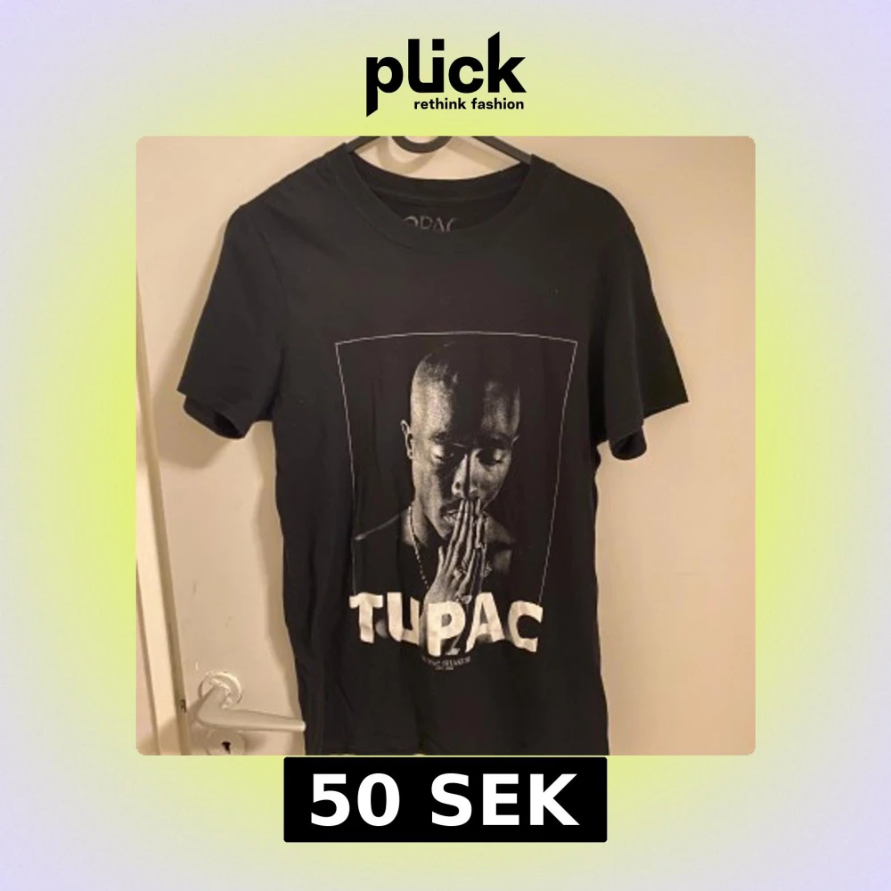 Cool svart T-shirt med ett stort tryck av Tupac på framsidan. Perfekt för fans av hiphop och streetwear. T-shirten har en klassisk rund hals och korta ärmar.
