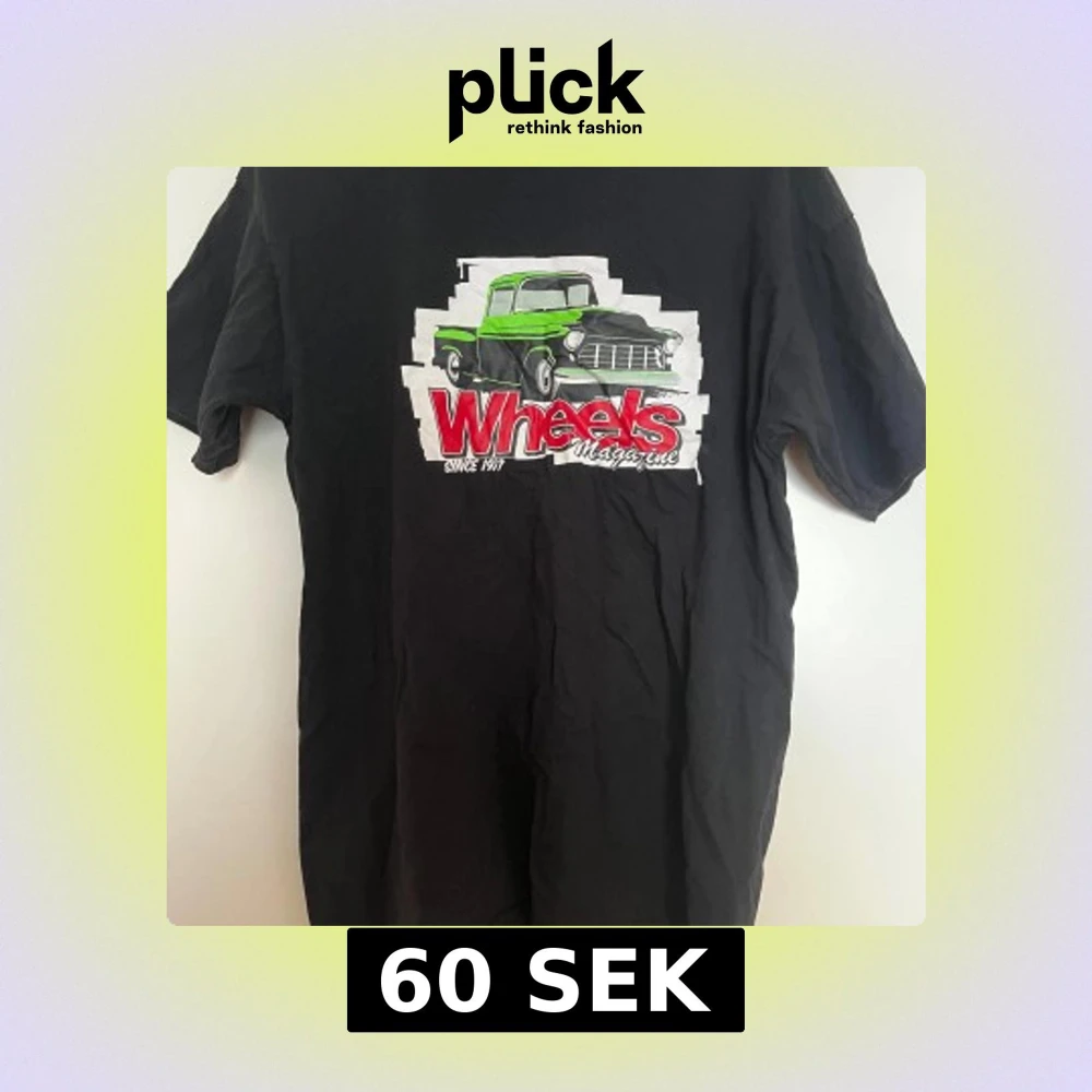 Cool svart t-shirt från Fruit of the Loom med stort tryck av en grön och svart bil samt texten 'Wheels Magazine' på bröstet. Klassisk passform och rund hals. Perfekt för dig som gillar bilar och retrostil.