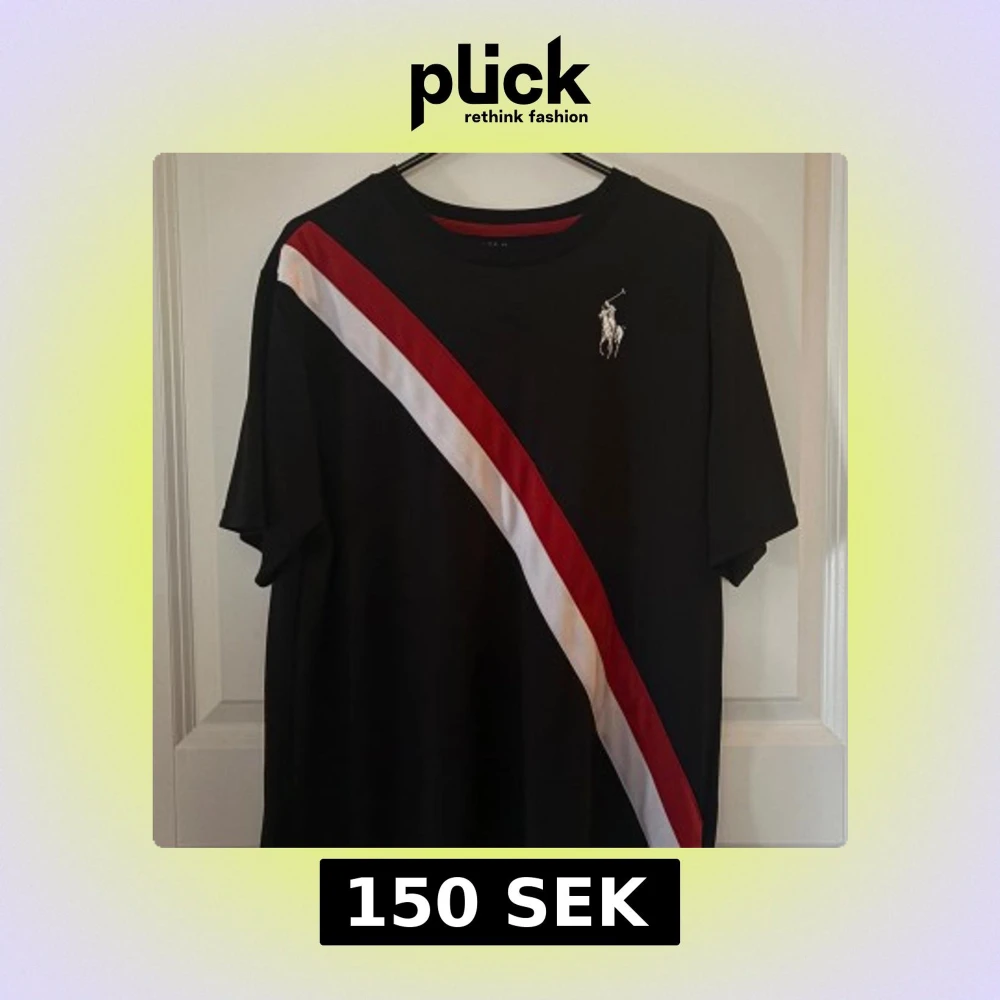 Svart t-shirt från Polo Ralph Lauren i storlek Youth XL, strlk 170 (18-20) med diagonal röd och vit rand över framsidan och klassisk tryckt logga på bröstet. 100% polyester, Ralph Laurence Performance. Ej använd.