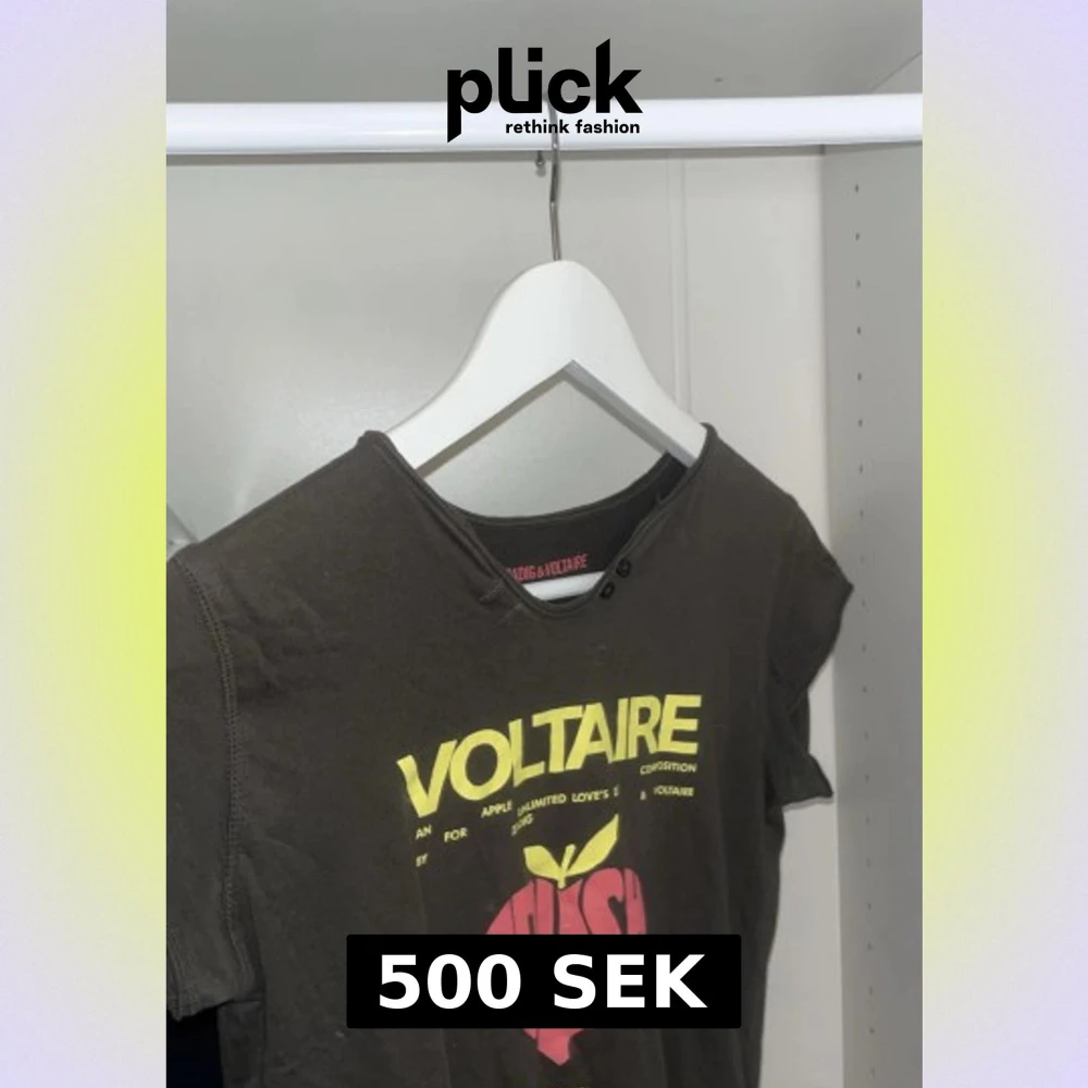 Cool mörk grökt-shirt från Zadig & Voltaire med tryck i gult och rött framtill och turnélista på ryggen. Rund hals med råa kanter och två svarta knappar vid halsen. Materialet är mjuk bomull och passformen är normal. Nypris ca 800, nästan aldrig använd.