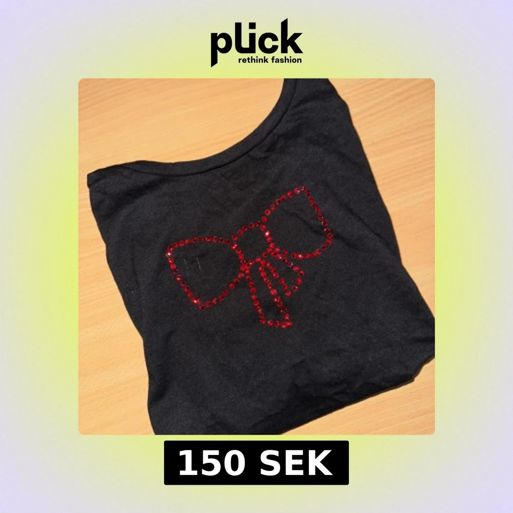 Svart topp med en stor rosett framtill, dekorerad med röda paljetter. Rund halsringning och mjukt. Tröjan är i grund från lager 157, går att tvätta OBS! Bara i 30 grader, ingen torktumling