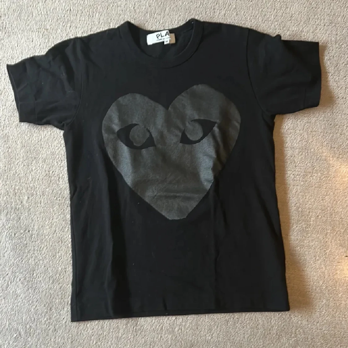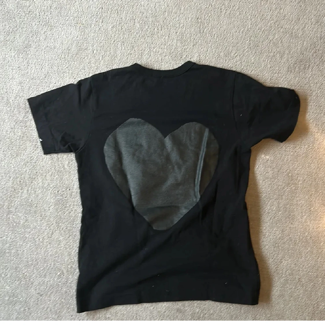 Snygg svart t-shirt från comme de garcons med ett stort hjärtmönster på framsidan. T-shirten har korta ärmar och en klassisk passform. för mer frågor är de bara och skriva