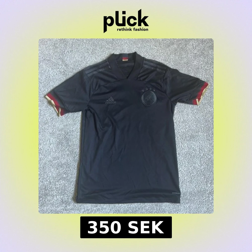 Säljer en svart Tyskland fotbollströja från Adidas med broderad landslagslogga och fyra stjärnor på bröstet. Tröjan har korta ärmar med detaljer i rött och guld samt klassisk krage. Tröjan är använd men har inga defekter. Köparen står för frakt. Medela mig om du har några frågor!