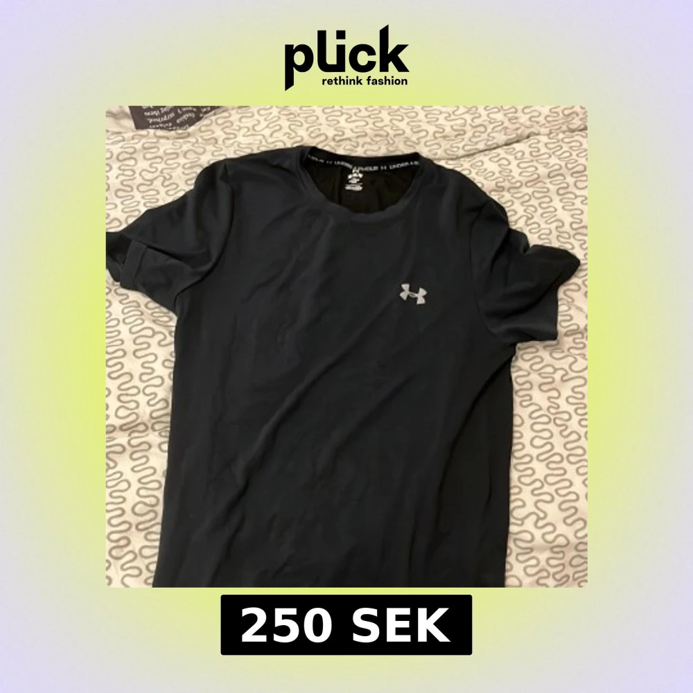 Svart t-shirt från Under Armour i storlek M. Stilren design med logga på bröstet och diskret logga i nacken. Tillverkad i mjukt och lätt polyester som andas, perfekt för träning. Klassisk rund hals och korta ärmar för en sportig look.