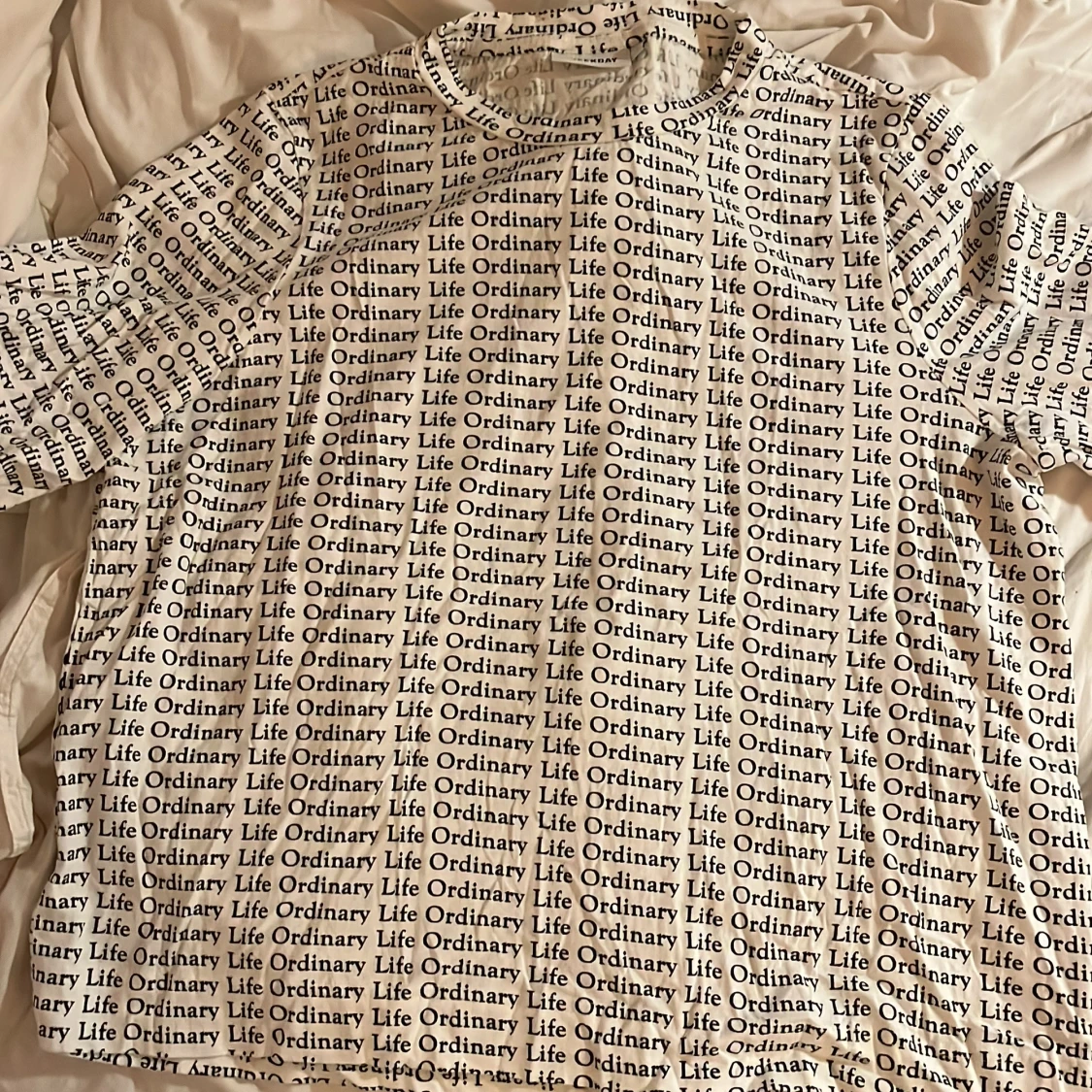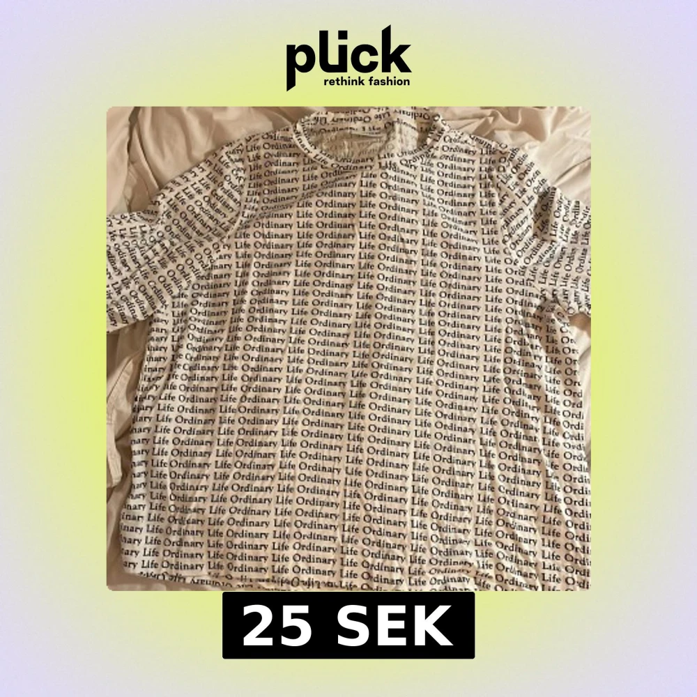 Vit t-shirt från Weekday i storlek L med svart textprint över hela plagget där det står 'Ordinary Life'. Klassisk rund hals och korta ärmar. Passar även för de med storlek M! Super fint skick!