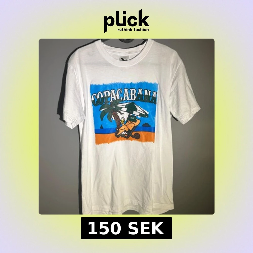 Vit t-shirt med färgglatt Copacabana-tryck framtill. Motivet visar en tecknad figur som chillar under en palm med paraply, strand och hav i bakgrunden. Klassisk passform och rund hals, perfekt för sommarvibbar. Köpt förra matchen mot Rosenborg och inte använt den sedan dess.