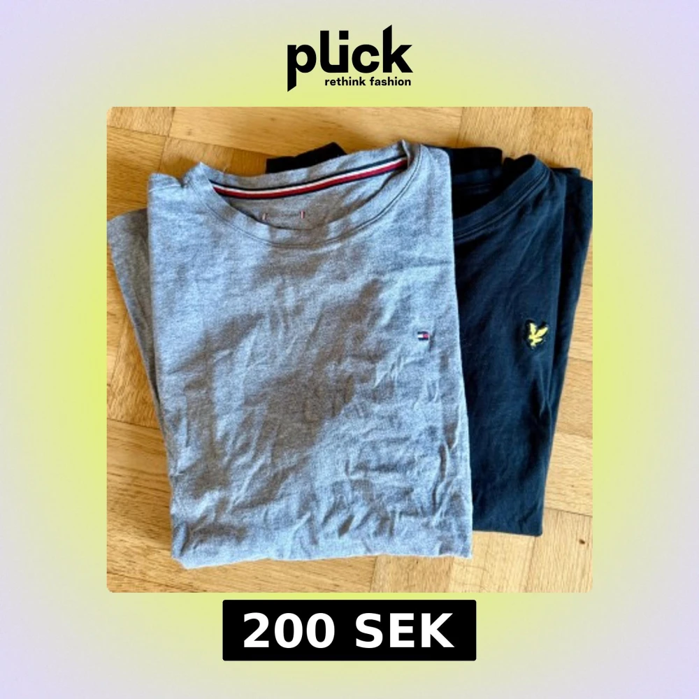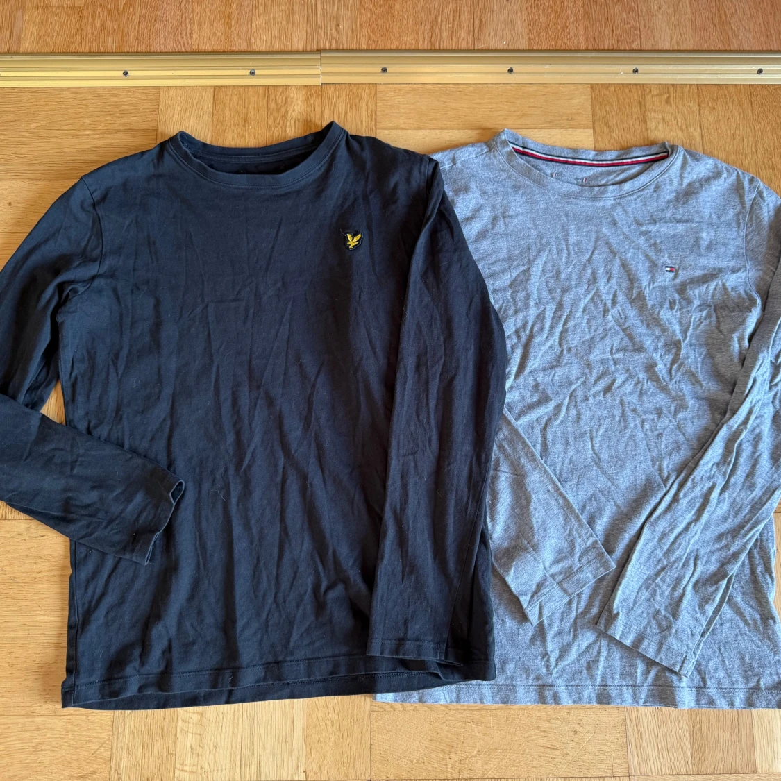 Två stilrena långärmade tröjor: en grå från Tommy Hilfiger med diskret logga på bröstet och en svart från Lyle & Scott med gul broderad logga. Båda är i mjuk bomull och har klassisk passform. Perfekta för en clean och enkel look.