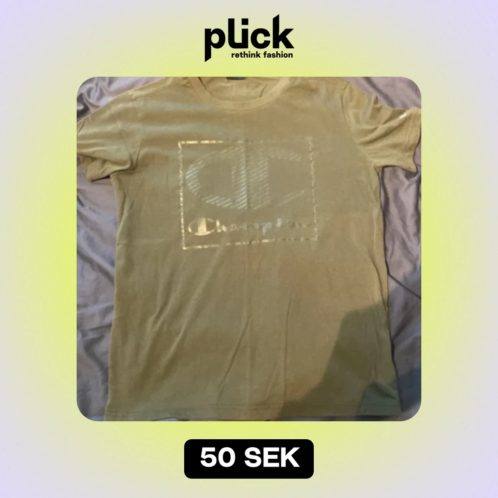 Säljer en olivgrön t-shirt från Champion i storlek medium. Den har ett stort, Champion-logotryck på framsidan och en liten broderad logga på ärmen.