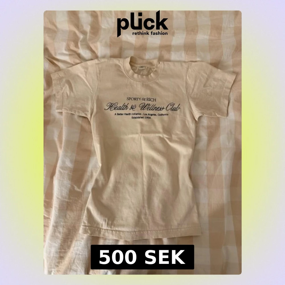 Beige t-shirt från Sporty & Rich med svart textprint på bröstet. Klassisk rund halsringning och korta ärmar. Tillverkad i mjuk bomull och har en clean, stilren look. Perfekt för dig som gillar minimalistisk och sportig stil. Använd fåtal gånger.
