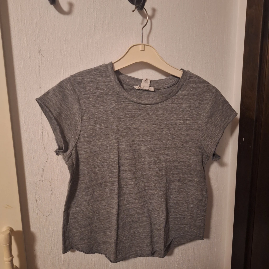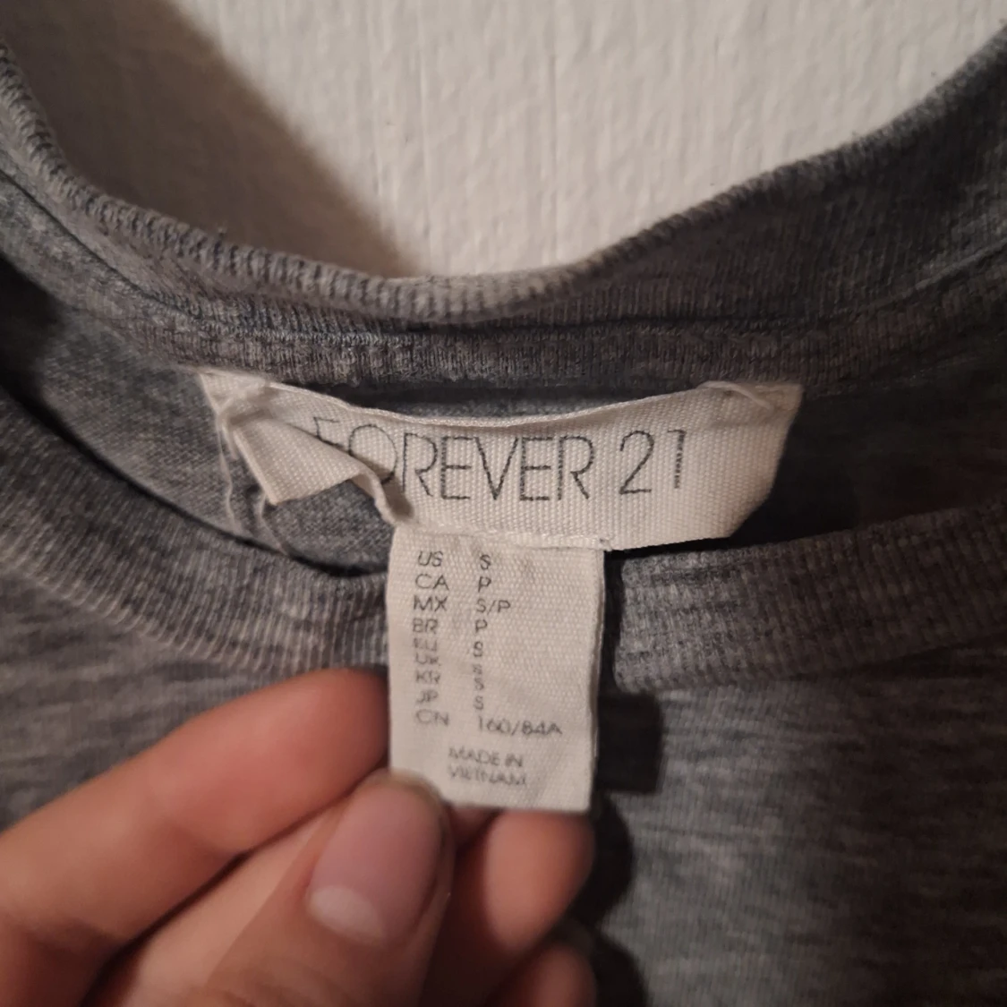 En basic grå t-shirt från Forever 21 i mjuk bomullsmix. Modellen har rund halsringning, korta ärmar med råa kanter och en avslappnad passform. Perfekt att styla med jeans eller kjol för en enkel och clean look.