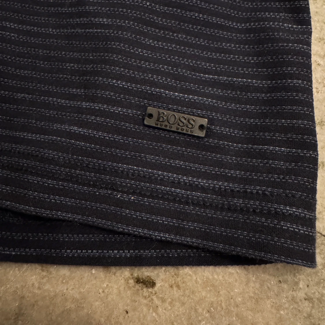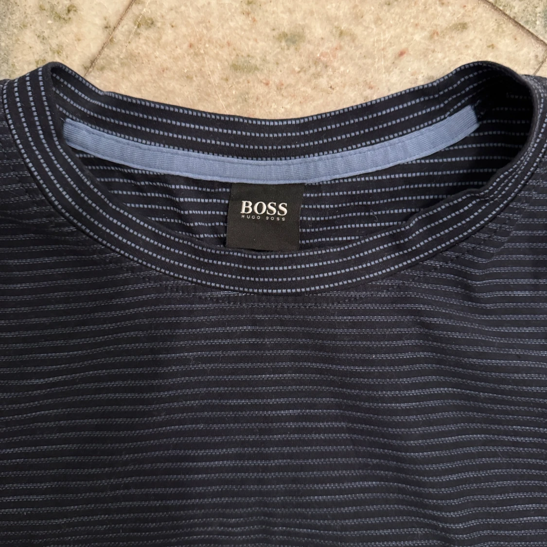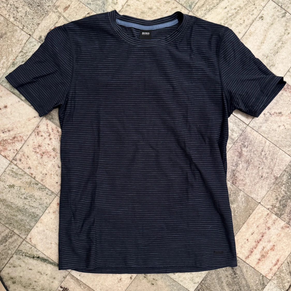 Snygg randig t-shirt från Hugo BOSS i mörkblått med subtila ljusblå ränder. Perfekt för en stilren look. T-shirten har korta ärmar och en klassisk rund halsringning.