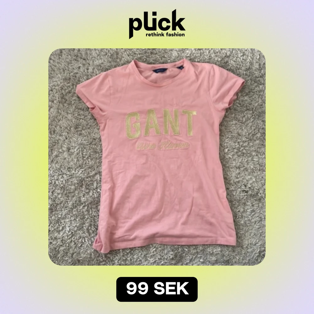 Säljer en snygg rosa t-shirt från GANT med guldfärgad text 'GANT New Haven' på bröstet. T-shirten är i bomull och har korta ärmar. Perfekt för sommaren eller vardagsbruk. 💗