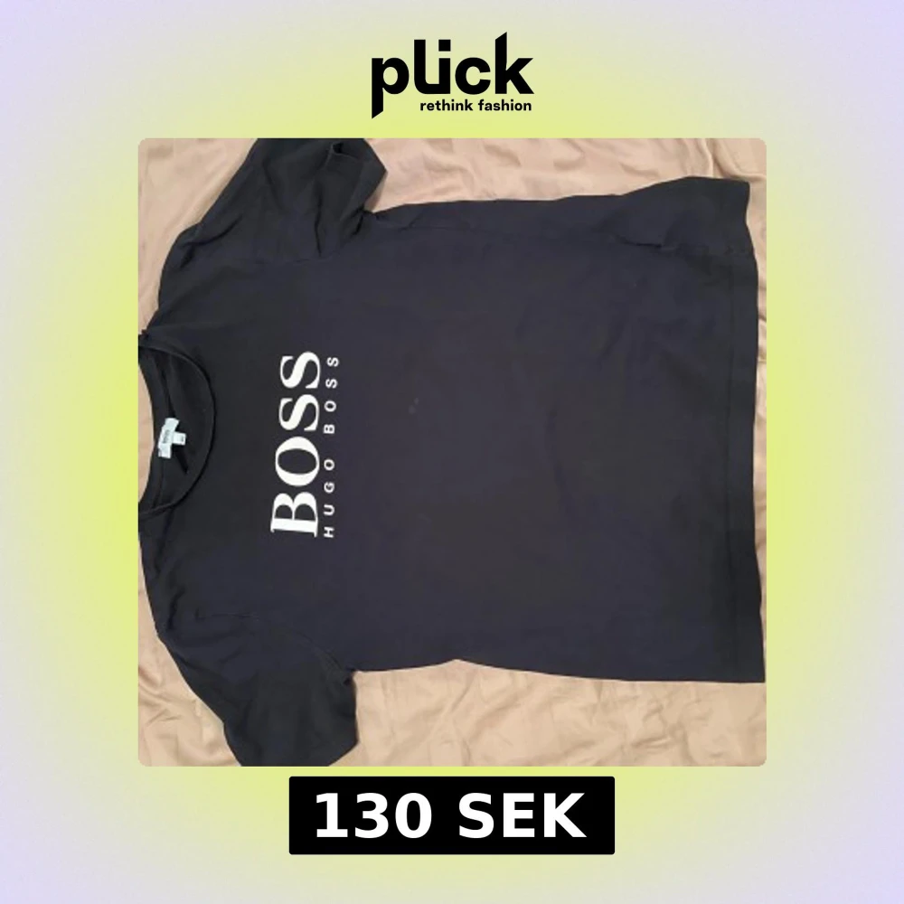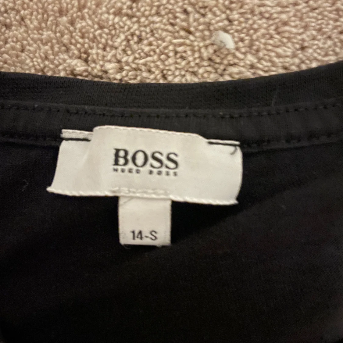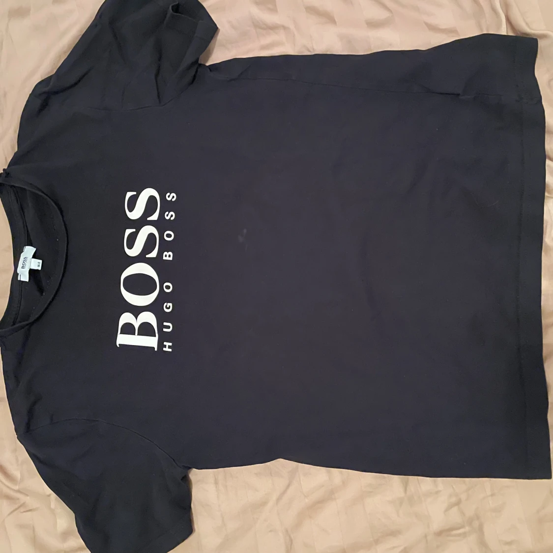 Svart t-shirt från Hugo Boss med stort vitt BOSS-tryck på bröstet. Klassisk passform med rund hals och korta ärmar. Tillverkad i mjuk bomull som känns skön mot huden. Perfekt för dig som gillar stilrena och snygga logotishirts. Den har ett litet hål på vänster axel men det syns knappt och går att sy, men det behövs egentligen inte