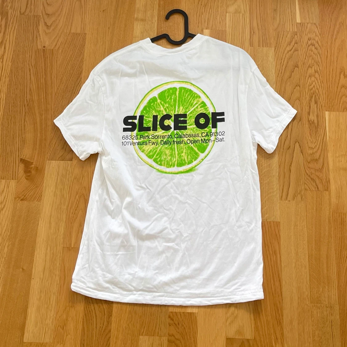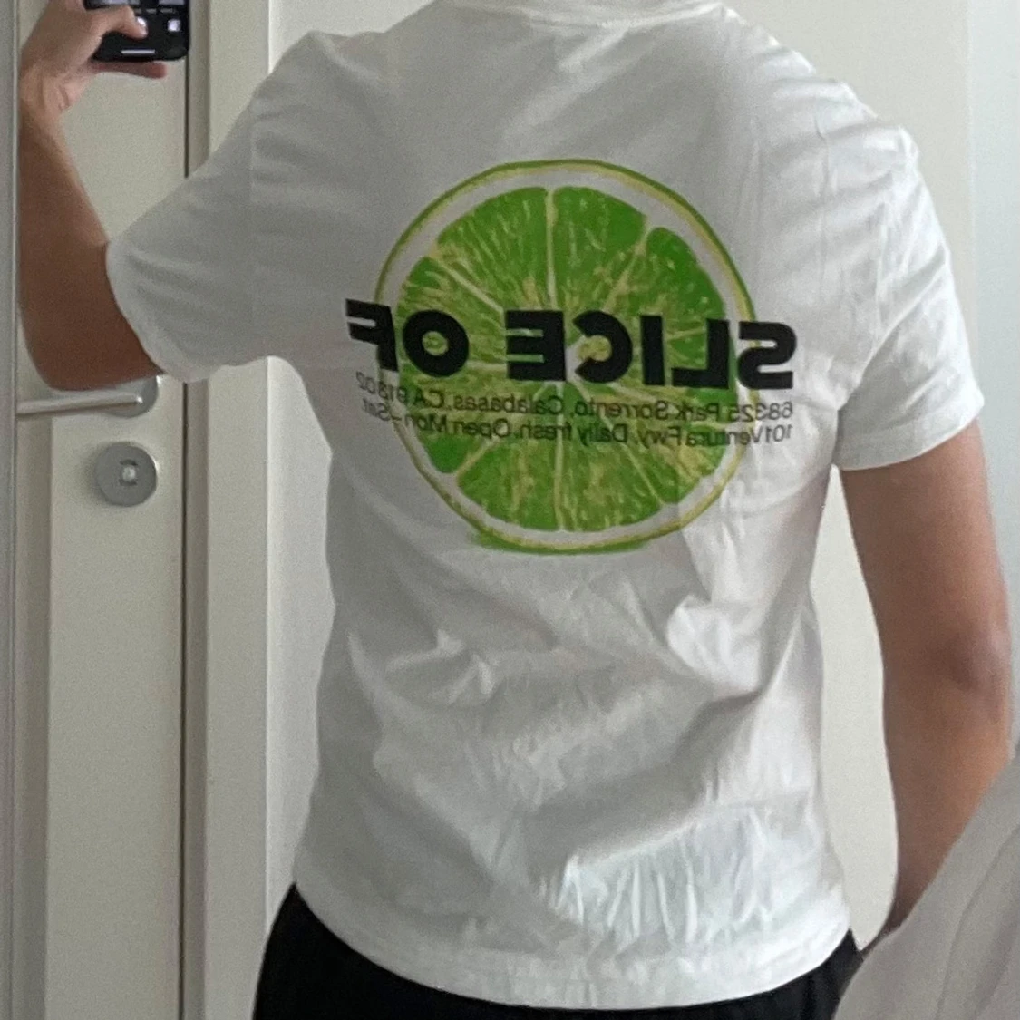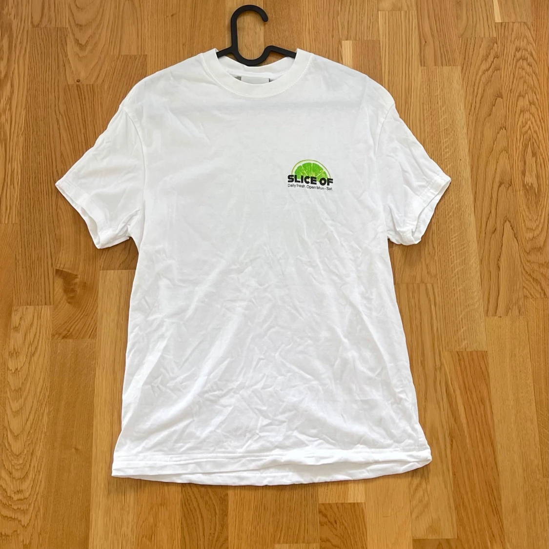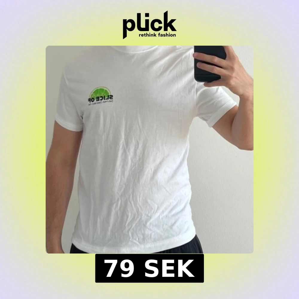 Vit t-shirt. Storlek S. Med tryck fram och bak.