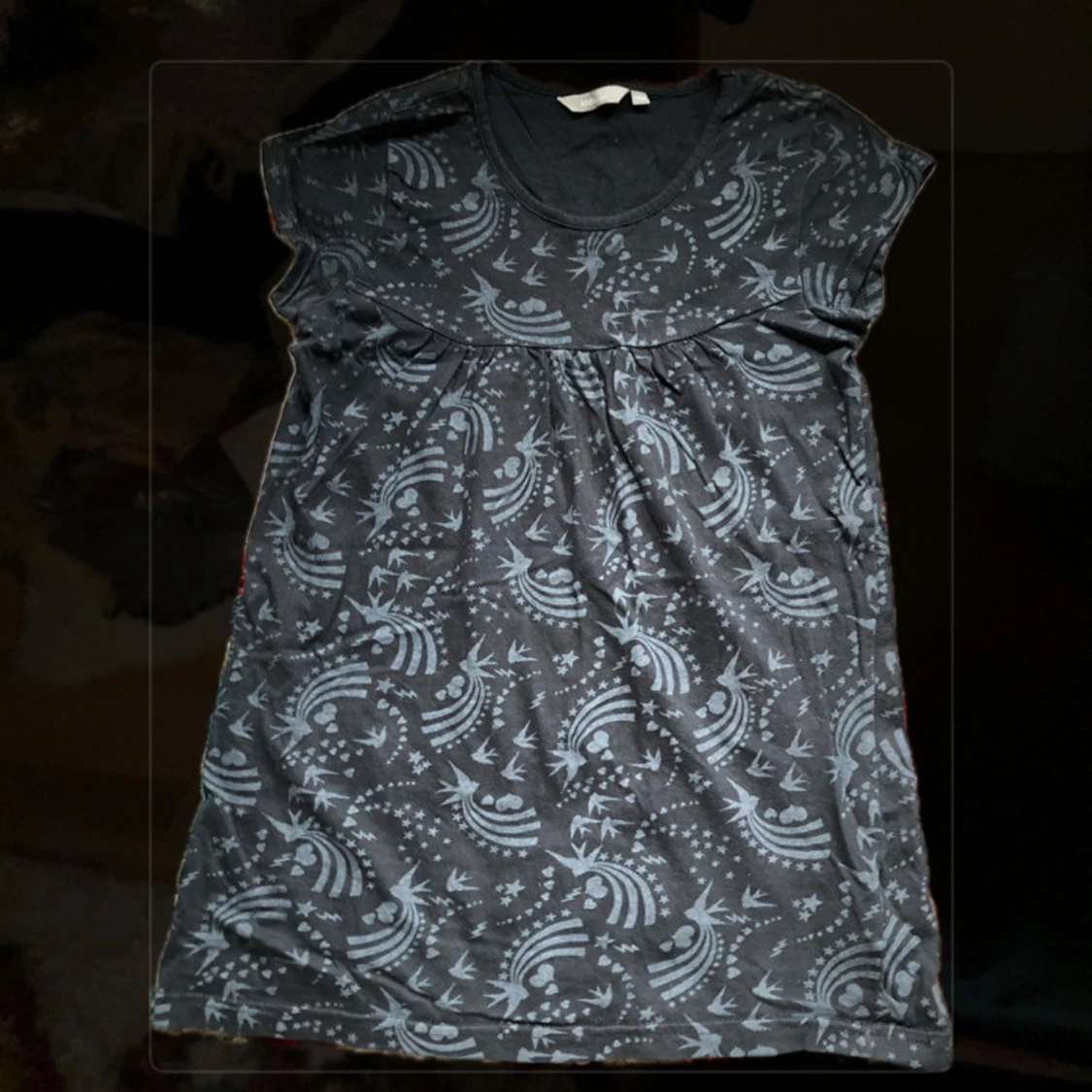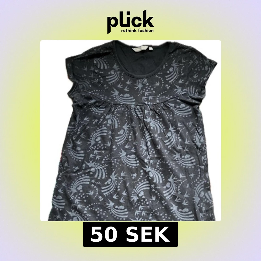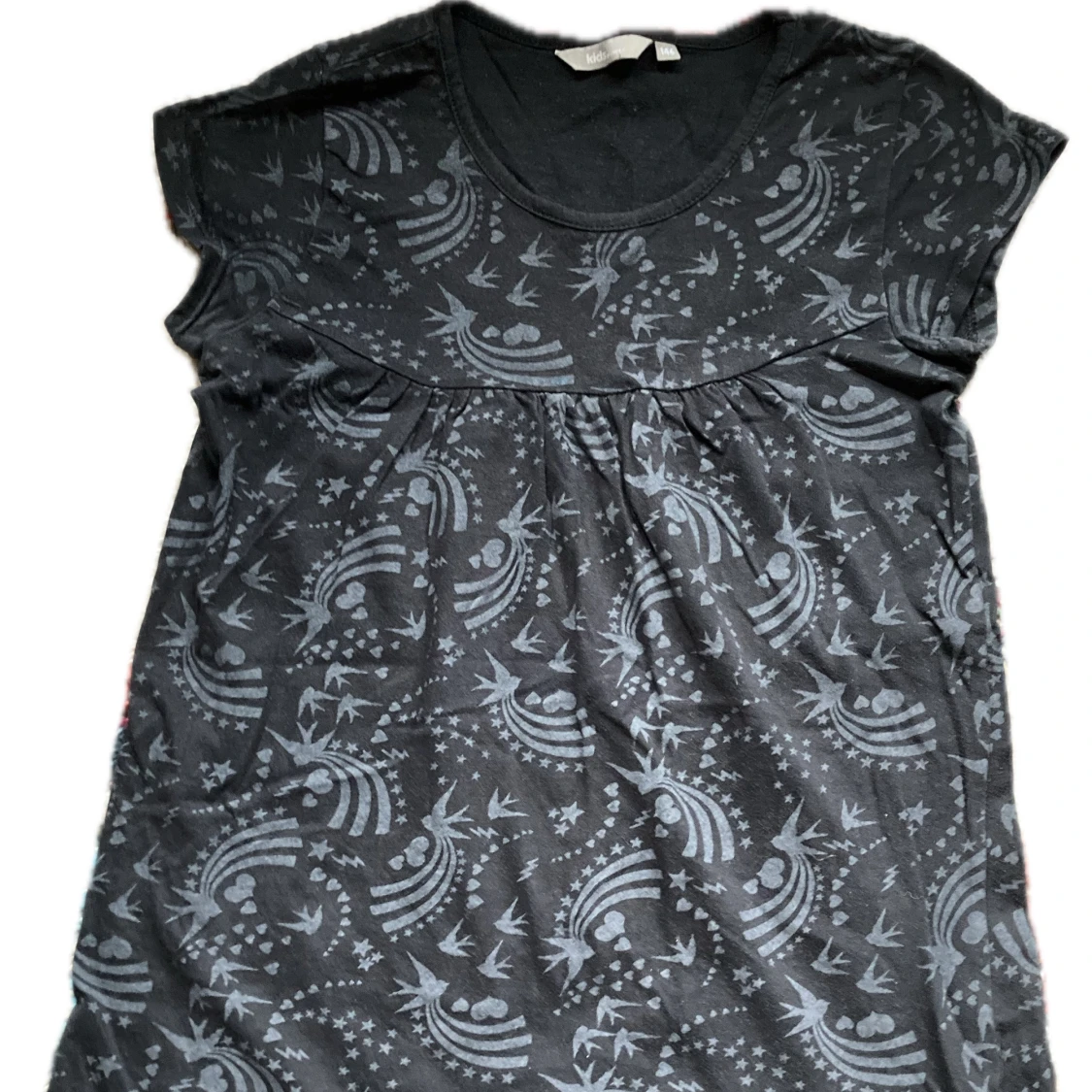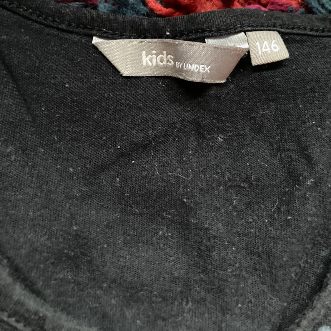 Säljer en svart tröja från Lindex med ett unikt mönster av regnbågar. Tröjan har korta och små ärmar och en rund nacke.