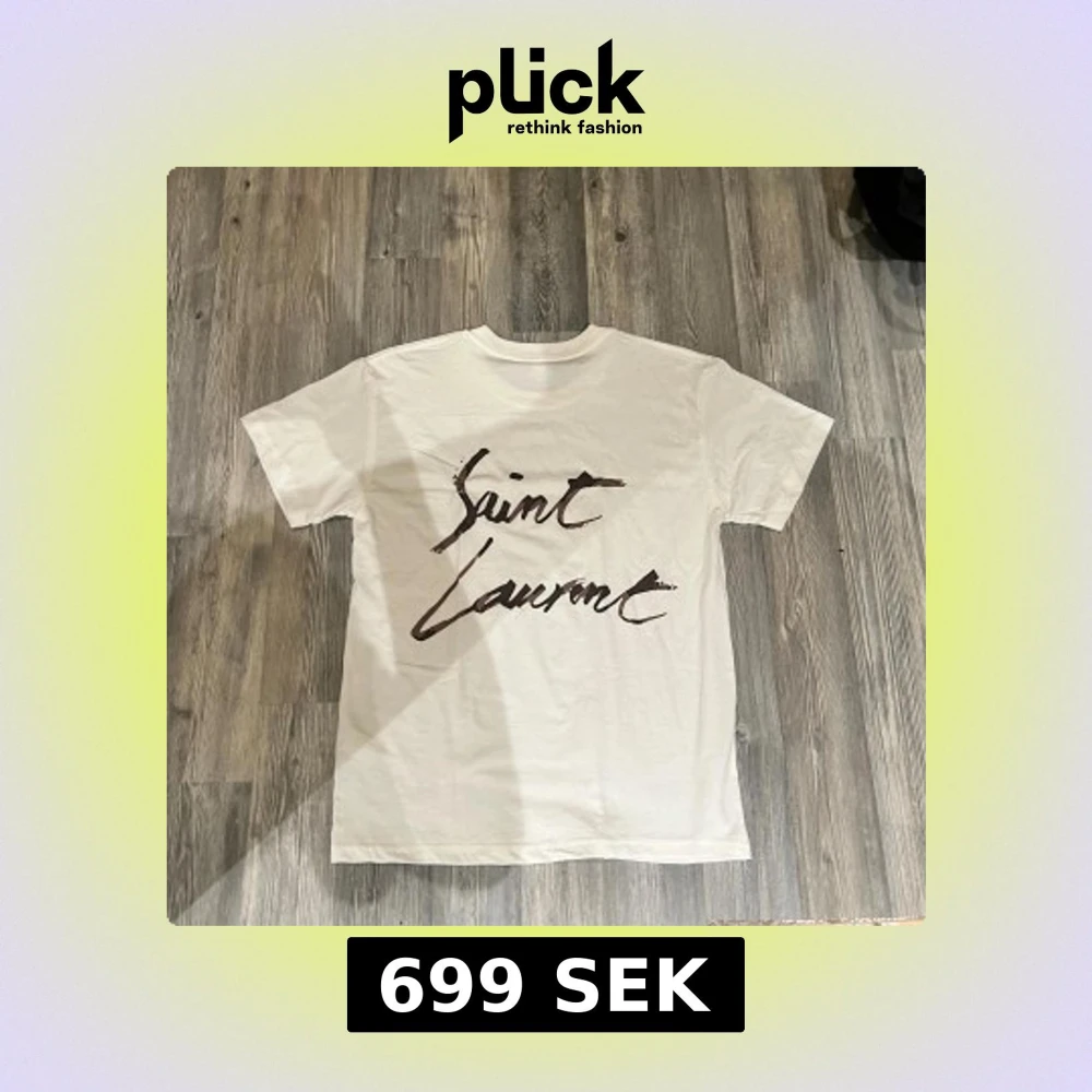 Säljer en vit t-shirt från Saint Laurent med stort handskrivet logotryck i svart på ryggen. T-shirten har klassisk rund hals och korta ärmar. Materialet är mjuk bomull som känns skönt mot huden. Perfekt för dig som gillar stilrena designer med en lyxig touch.