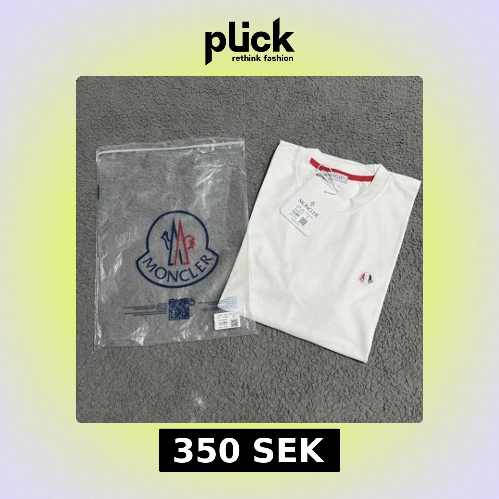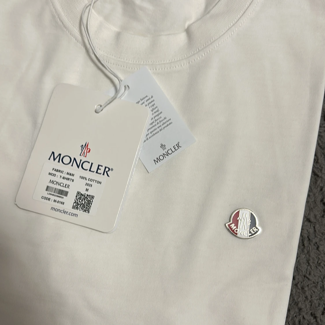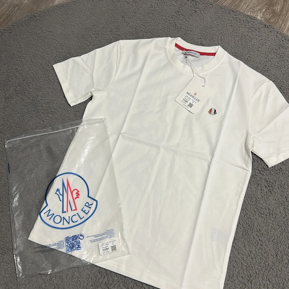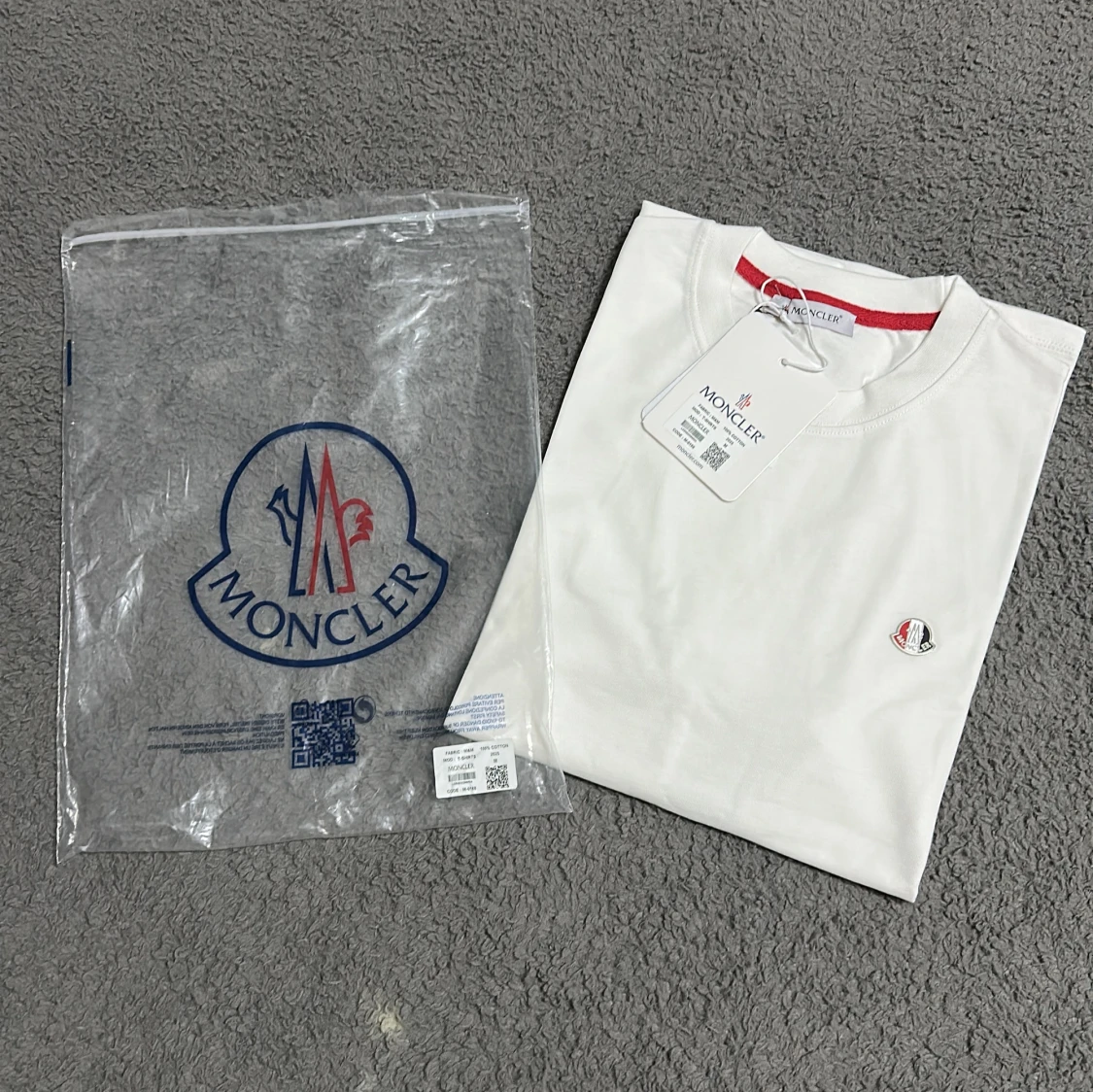 Vit t-shirt från Moncler i mjuk bomull med klassisk rund hals och korta ärmar. Diskret Moncler-logga på bröstet och röd detalj på insidan av kragen. Perfekt för dig som gillar stilrena och exklusiva plagg.