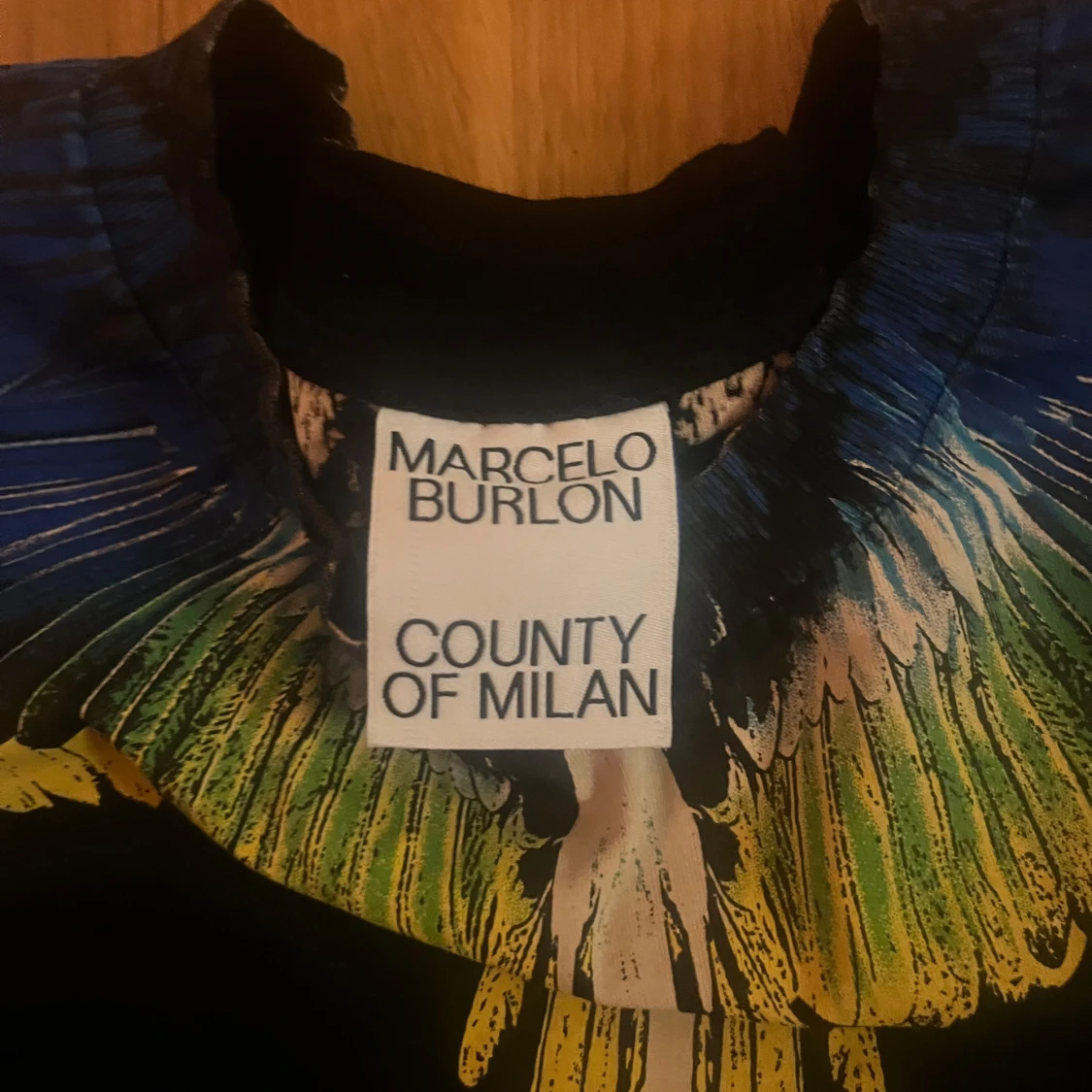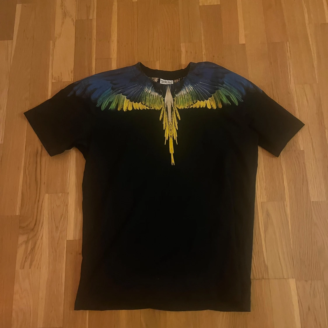 Svart t-shirt från Marcelo Burlon County of Milan med färggrafiskt tryck av vingar i blått, grönt och gult över axlar och hals. Klassisk rund hals och korta ärmar. Materialet är mjuk bomull och passformen är normal. Perfekt statement-plagg för dig som gillar streetwear.