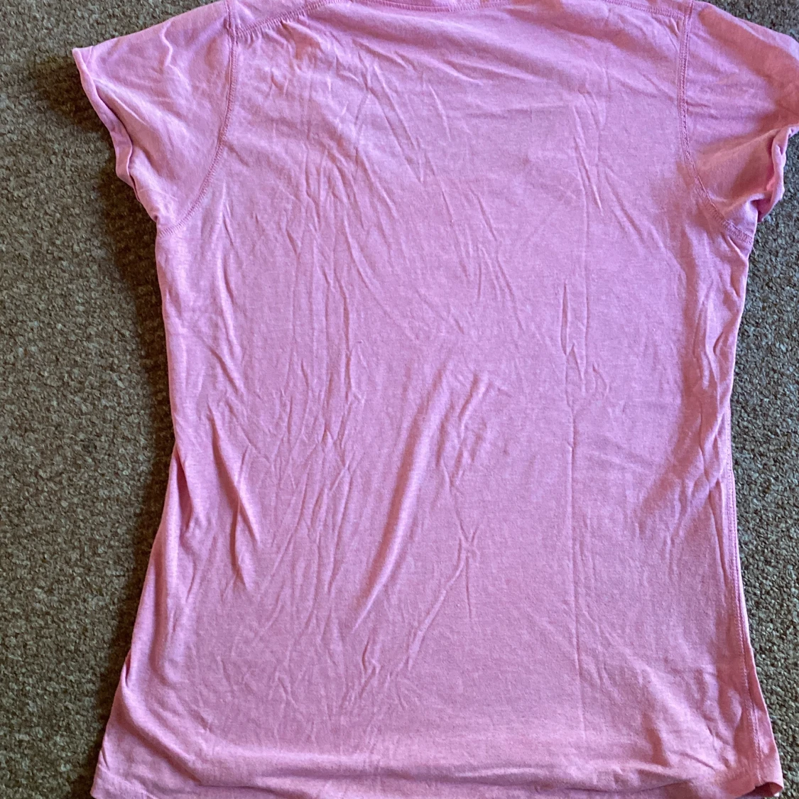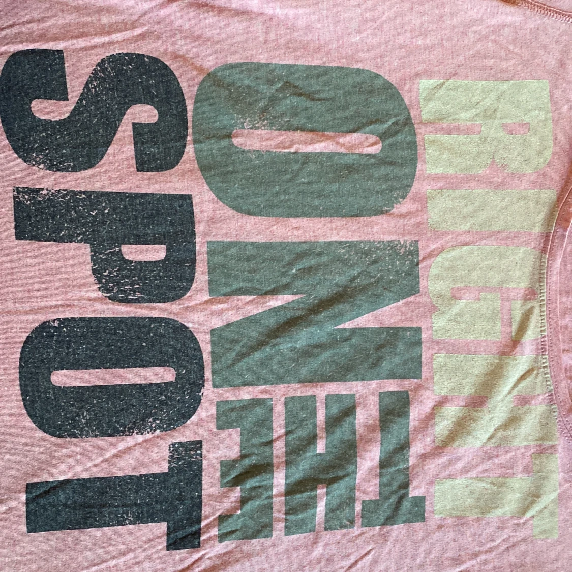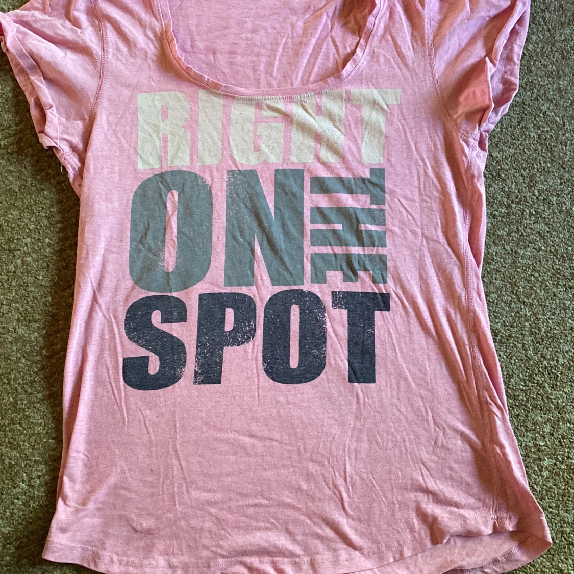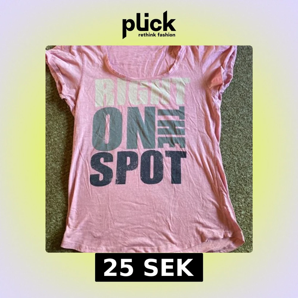 Säljer en rosa Oversize t-shirt med stort tryck i svart och ljusgrönt där det står 'RIGHT ON THE SPOT' på framsidan. T-shirten har rund halsringning och korta ärmar. Perfekt för en avslappnad stil.