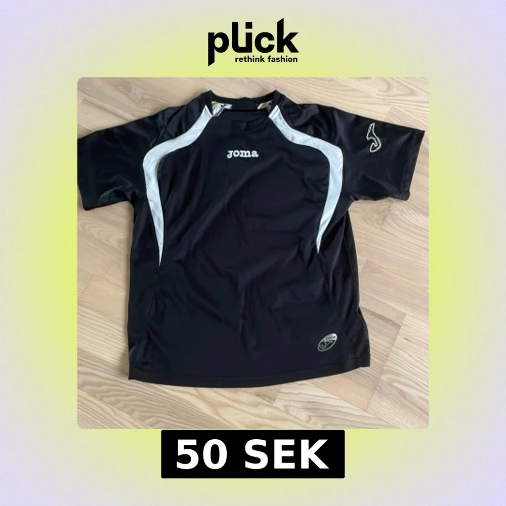 Säljer en svart sport t-shirt från Joma med vita detaljer längs axlar och sidor. T-shirten har korta ärmar och rund hals. Perfekt för träning eller fotboll. Joma-logga på bröstet och ärmen.