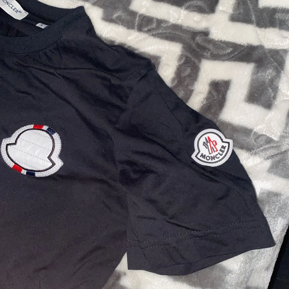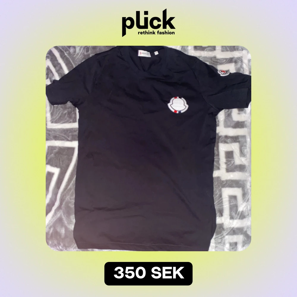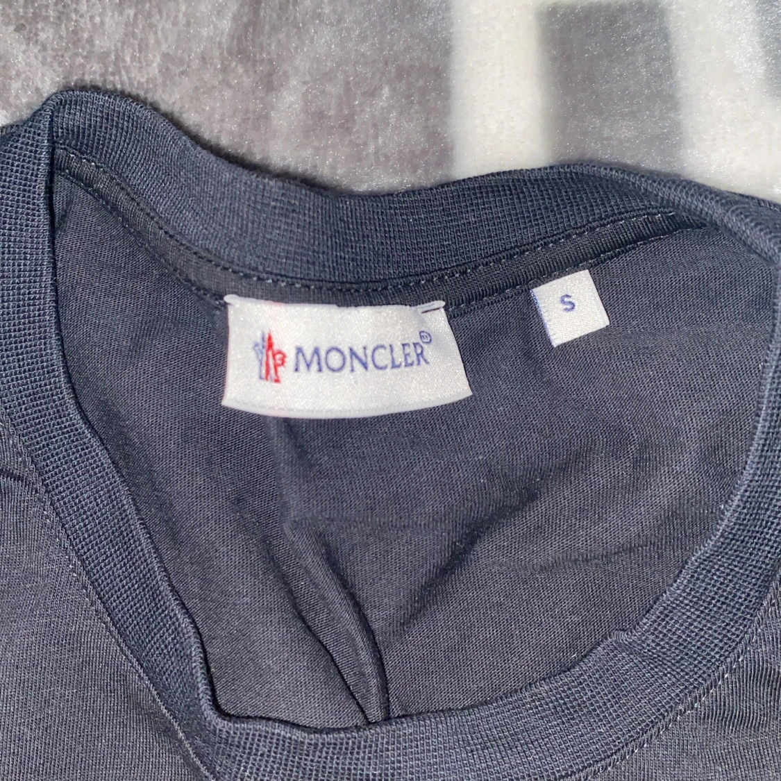 Säljer en snygg svart t-shirt från Moncler i storlek S. Den har ett coolt Moncler-märke på bröstet och ärmen. Perfekt för en stilren och avslappnad look. Passar bra till både vardag och fest!