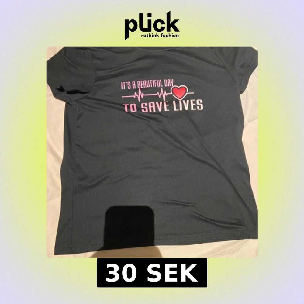 Svart t-shirt med korta ärmar och tryck framtill: 'It's a beautiful day to save lives' i rosa och vitt, samt ett rött hjärta och EKG-linje.