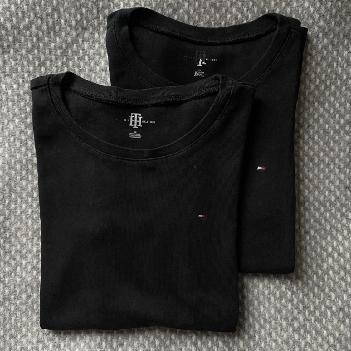 Två T-shirts i bomull från Tommy Hilfiger i storlek XS/S (S petite). Köpta i en av deras butiker för några år sedan. Tröjorna är i fint skick! Skriv gärna för fler bilder! (OBS priset är för båda tröjorna!)
