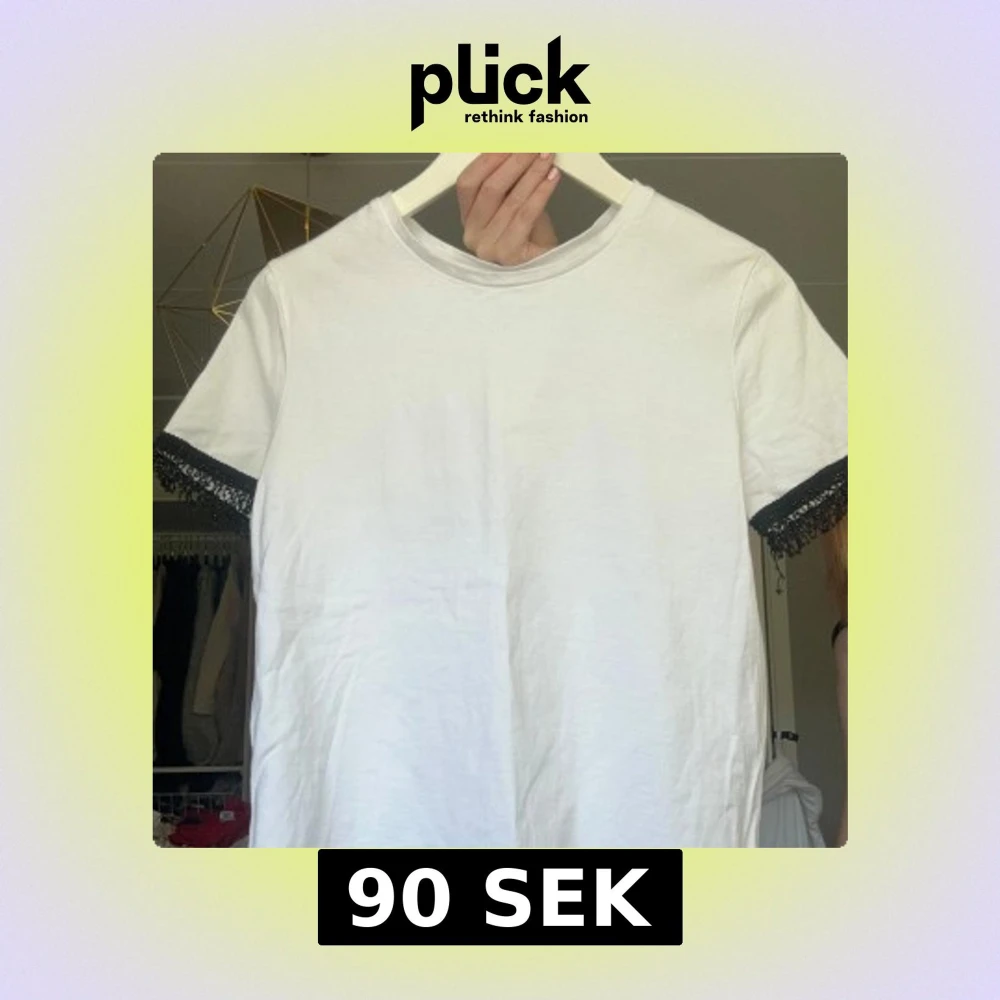 Säljer en vit t-shirt från Zara med fina svarta spetsdetaljer vid ärmsluten. Klassisk rund halsringning och rak passform. Perfekt för dig som gillar enkla plagg med en twist.