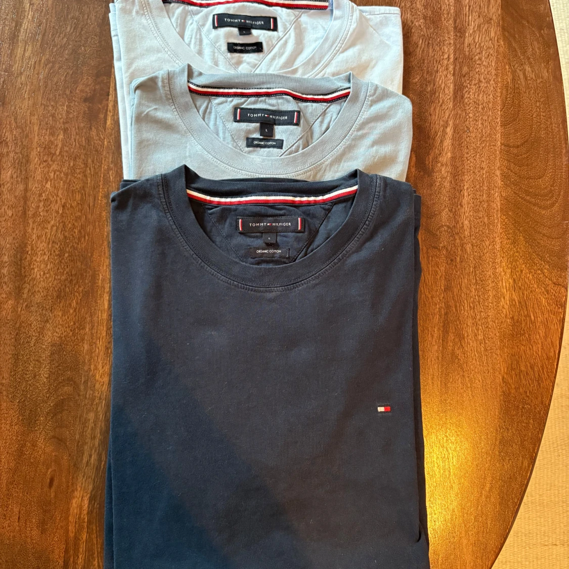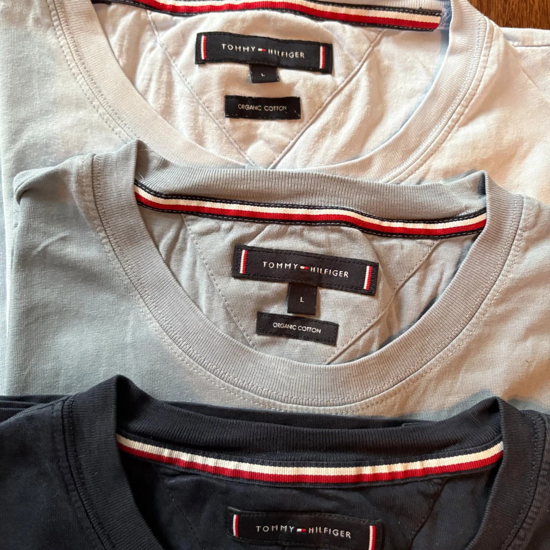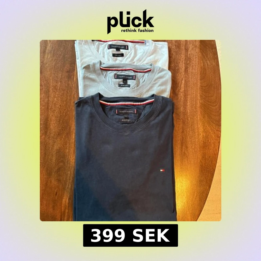 Säljer tre stilrena t-shirtar från Tommy Hilfiger i olika färger: marinblå, ljusblå och vit. De är tillverkade i kvalitativ bomull och är sparsamt använda. Storlek L men små i storleken. Passar för runt 170-180. Kan säljas separat också.