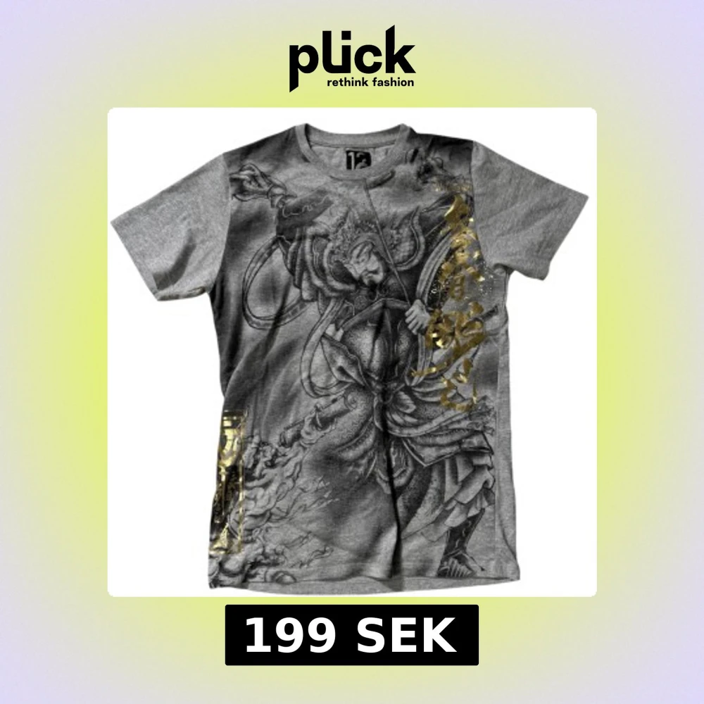 Snygg grå t-shirt med ett detaljerat tryck av en krigare i svart och guld. Kortärmad och perfekt för en cool och unik stil. Passar bra till jeans eller shorts för en avslappnad look.