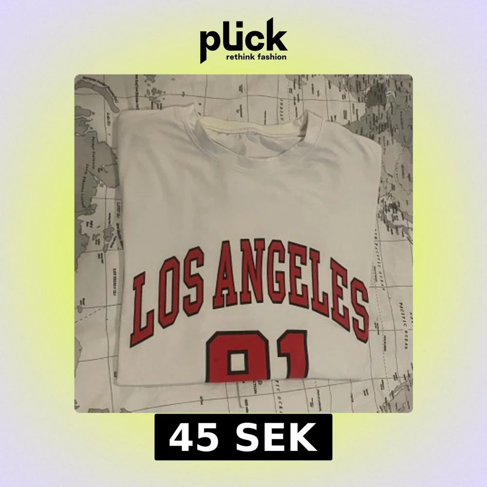 Vit t-shirt med stort rött och svart tryck där det står 'LOS ANGELES 91' på framsidan. Klassisk rund halsringning och korta ärmar.
