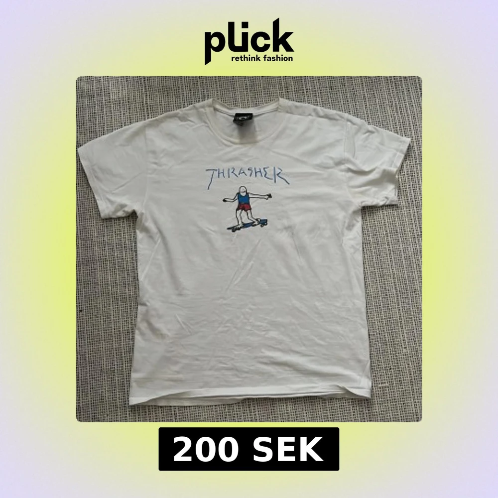 Vit t-shirt från Thrasher med ett unikt tryck av en tecknad figur