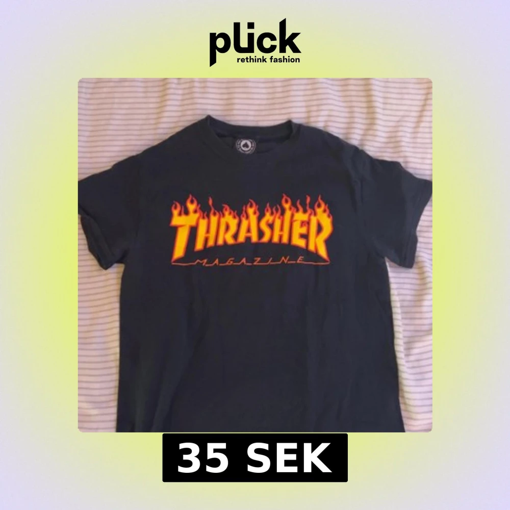 Svart t-shirt från Thrasher med ikoniskt flames-tryck i gult och orange på bröstet. Klassisk passform och rund hals. Perfekt för dig som gillar streetwear och skatekultur. Materialet är mjuk bomull.