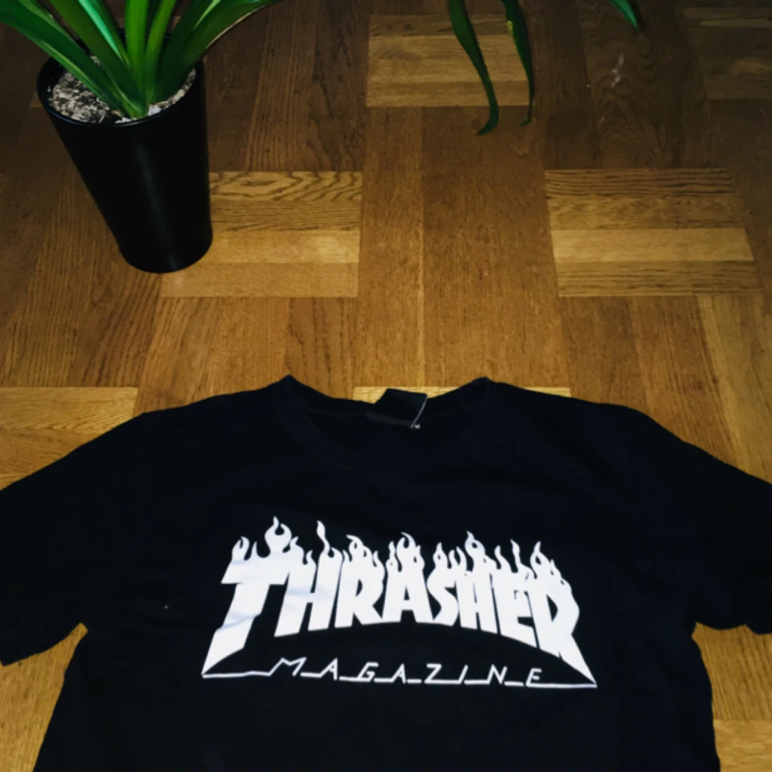 En avklippt Thrasher-tshirt med eldflammor på baksidan. Asnice !!!