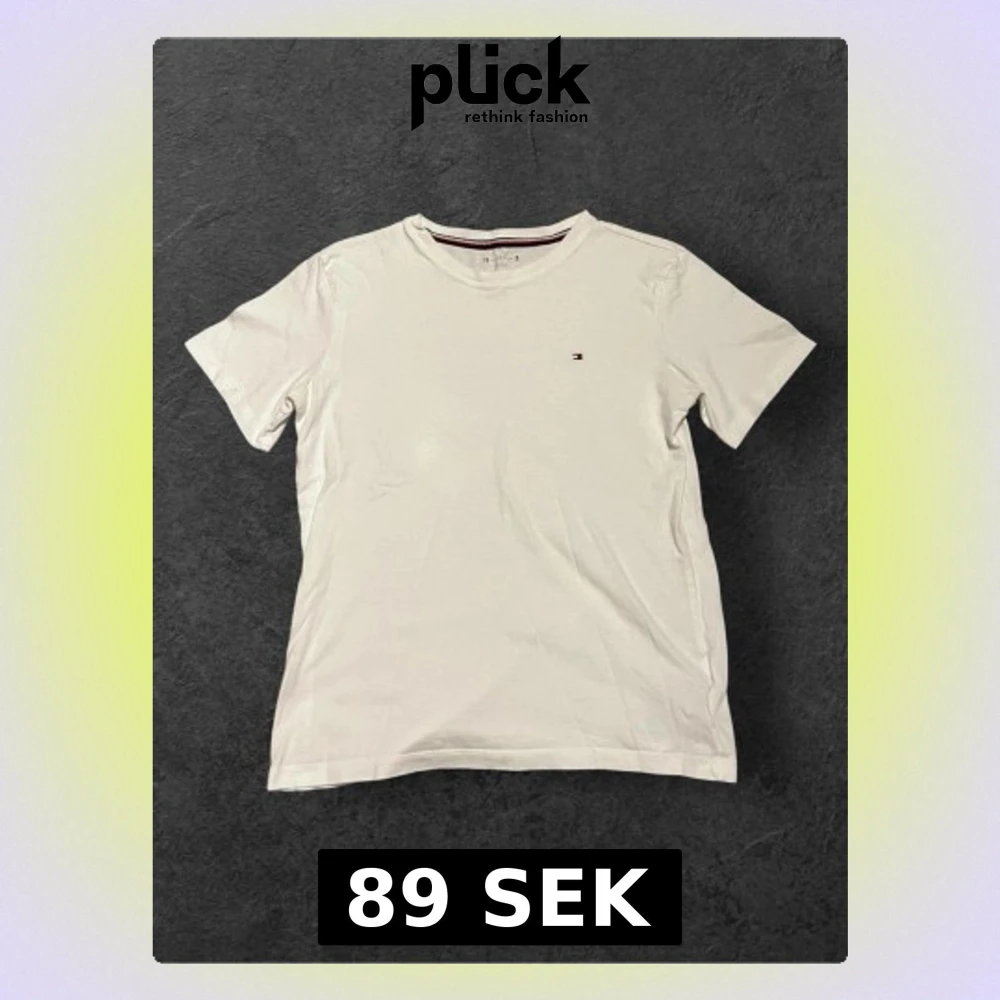Vit t-shirt från Tommy Hilfiger med klassisk rund hals och diskret logga broderad på bröstet. Halsringningen har en snygg detalj med röd, vit och marinblå rand. Tillverkad i mjuk bomull för skön känsla hela dagen.