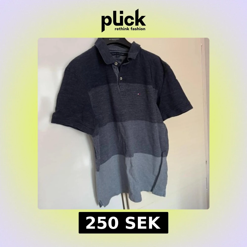 Säljer en stilren blå och grå pikétröja från Tommy Hilfiger. Tröjan har korta ärmar och en klassisk krage med knappar. Perfekt för en avslappnad look. Den har ett diskret märke på bröstet.